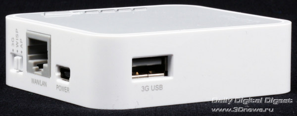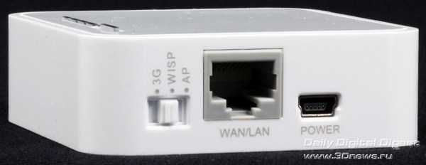 На одной из боковых граней находится самый обычный USB-порт для подключения сотового модема. На соседней с ней — разъём питания mini-USB, порт Ethernet и трёхпозиционный переключатель режима работы роутера.