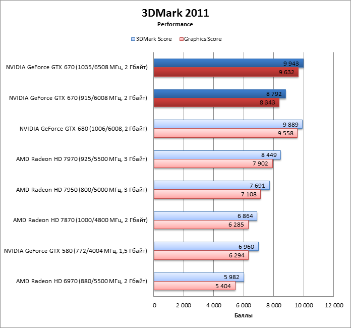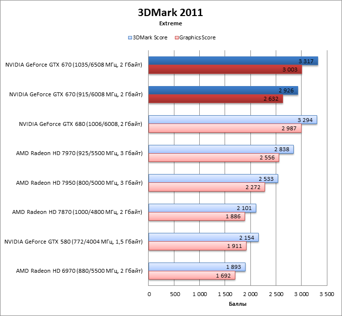 Производительности невзрачного кулера GTX 670 хватило, чтобы в штатном режиме обеспечить рабочие температуры, практически такие же, как у GTX 680. Radeon HD 7950 и HD 7970, снабженные мощными системами охлаждения с испарительными камерами, нагреваются меньше, а GeForce GTX 580 и Radeon HD 6970 — чуть сильнее. Максимальные обороты турбины снижают температуру карты на 10 °С под нагрузкой, несмотря на разгон. ![]() По энергопотреблению под нагрузкой карта эквивалента Radeon HD 7950. Есть заметное преимущество перед GTX 680, которое сохраняется даже после разгона. ![]() ⇡#Производительность, синтетические тесты3DMark 2011