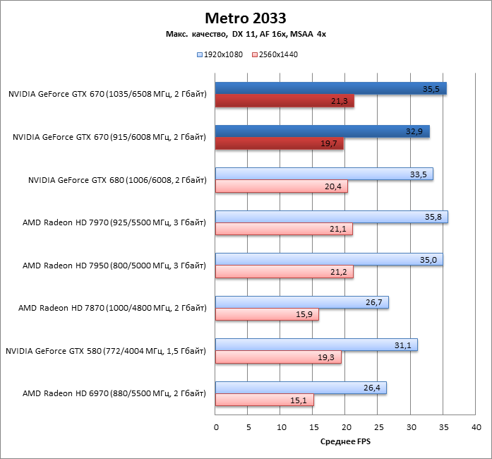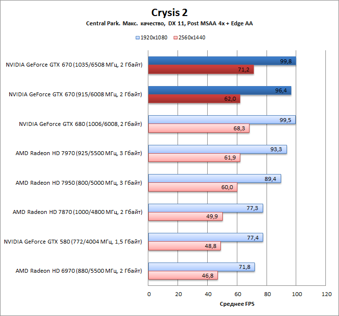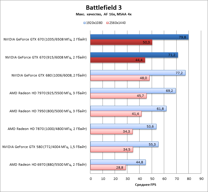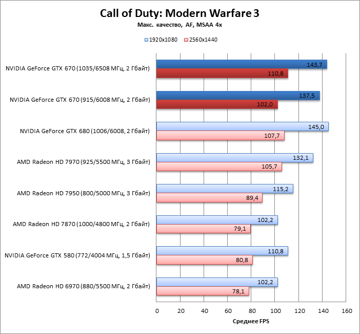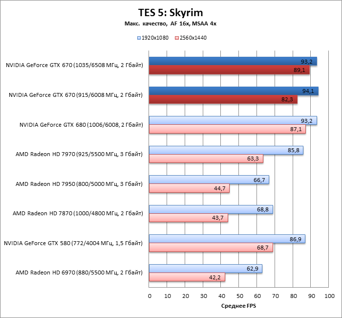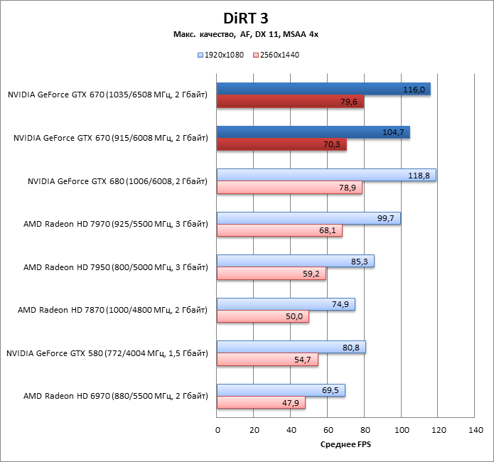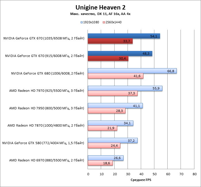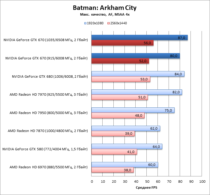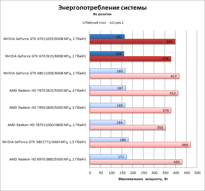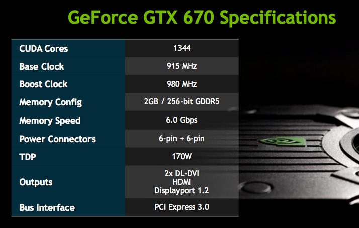 ⇡#ВведениеПодробный обзор архитектуры Kepler, на которой основаны карты серии GeForce 600, вы можете прочитать в статье про флагманскую модель, GTX 680. А для тех, кто уже в курсе, повторим краткое резюме архитектуры из обзора GeForce GTX 690. Вкратце: Kepler представляет собой апгрейд архитектуры Fermi, которую NVIDIA использовала в сериях GeForce 400 и GeForce 500. В ядре произошел ряд оптимизаций, но главное изменение состоит в увеличении числа вычислительных блоков: чип GK104 содержит втрое больше ядер CUDA и вдвое больше текстурных модулей по сравнению с GF110 (GeForce GTX 580). С другой стороны, GeForce GTX 680 в некоторых отношениях сделал шаг назад по сравнению с GTX 580: шина памяти уменьшилась с 384 до 256 бит, 32 ROP вместо 48, планировщики потоковых мультипроцессоров перешли от динамического к статическому планированию, что существенно снизило производительность в неграфических вычислениях. GK104 производится по техпроцессу 28 нм, и умеренное (по сравнению с ядром Tahiti в Radeon HD 7950/7970) число транзисторов позволило установить базовую тактовую частоту GPU 1006 МГц. Память в GTX 680 работает на эффективной тактовой частоте 6008 МГц. Кроме того, NVIDIA внедрила технологию динамического разгона GPU Boost, которая автоматически повышает частоту GPU в зависимости от энергопотребления и температуры. В дополнение к базовой частоте в спецификациях GTX 680 и 690 указана Boost Clock — средняя частота, которой достигает автоматический разгон в большинстве приложений. GeForce GTX 670, вторая одночиповая карта серии GeForce 600 в сегменте High-End, также построена на базе процессора GK104, но число вычислительных блоков GPU урезано. Из восьми потоковых мультипроцессоров (SMX) один отключен, поэтому в строю остается только 1344 ядра CUDA из 1536 и 112 текстурных модулей из 128. В остальном функциональность чипа изменений не претерпела: 32 ROP и 256-битная шина памяти. Референсная версия GeForce GTX 670 также комплектуется 2 Гбайт памяти, работающей на эффективной частоте 6008 МГц. GPU функционирует на базовой частоте 915 МГц (как в GTX 690), а типичная частота Boost Clock — 980 МГц. У GTX 680 частоты составляют 1006 и 1058 МГц. За счет этой разницы TDP карты удалось снизить до 170 Вт. TDP GTX 680 на 15 Вт выше. ![]() Несмотря на столь небольшое энергопотребление, GeForce GTX 670 позиционируется как конкурент Radeon HD 7950, а в некоторых случаях, по заявлению производителя, может потягаться и с HD 7970. Напомним, каково типичное энергопотребление этих карт: 200 и 250 Вт. GTX 670 обладает всеми функциями GTX 680: есть поддержка DirectX 11.1, карта может в одиночку выводить изображение на три монитора в режиме Surround или Surround 3D. Как и GTX 680, GTX 670 работает с шиной PCI-E 3.0, но официально для обеих карт этот режим поддерживается только на платформе Intel Ivy Bridge. На Sandy Bridge-E с чипсетом X79 PCI-E 3.0 пока заблокирован, но NVIDIA пообещала вскоре провести валидацию этой платформы. Рекомендованная розничная цена GTX 670 установлена на уровне $399, а специально для России — 13 999 руб. Кстати, примерно за такие деньги сейчас уже можно купить и Radeon HD 7950. ⇡#КонструкцияПоначалу GTX 670 выглядит как стандартная High-end карта, но вот мы переворачиваем ее, и видно, что печатная плата удивительно маленькая. Даже GeForce GTX 560 в референсной версии выпускается на более длинной PCB. А GTX 570 и вовсе построен на той же плате, что и GTX 580. Отсек кожуха с турбинкой системы охлаждения наращивает карту до привычной длины. Крыльчатка, как и в GTX 680, сделана из звукопоглощающего материала. И действительно, даже на полных