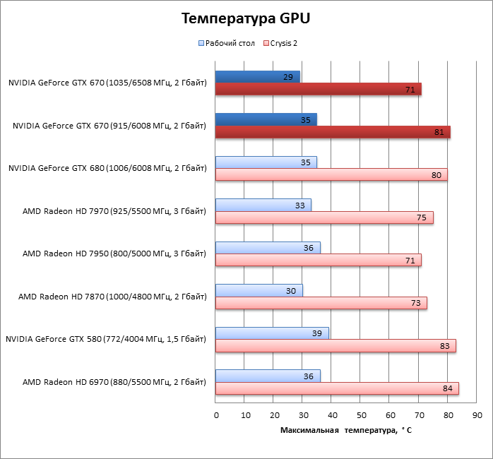 ⇡#Разгон, температура, энергопотреблениеКак и в случае с GeForce GTX 680 и GTX 690, при оверклокинге GTX 670 имеет значение не только базовая частота GPU, на которой карта работает стабильно, но и та частота, которую может обеспечить GPU Boost при возросшем в результате разгона энергопотреблении и тепловыделении. У всех трех карт, составляющих сейчас серию GeForce GTX 600, максимальный подъем над базовым уровнем, который предусматривает таблица шагов частоты GPU Boost, различается. Подробнее об этом написано в обзоре GTX 690. У GTX 670 довольно слабая PCB и система охлаждения, поэтому неудивительно, что среднее значение Boost Clock, которое указывает NVIDIA (980 МГц), меньше, чем у GeForce GTX 690 (1019 МГц), хотя базовая частота GPU у них одинаковая. Но вот что интересно: максимальная частота, которой достигает GTX 670, выше, чем у GTX 690: 1097 против 1071 МГц. То есть максимальный прирост составляет 182 МГц. Еще одна особенность работы GPU Boost на GTX 670: напряжение питания GPU не изменяется плавно вместе с частотой, а сразу поднимается до 1,175 В, как только карта переходит в 3D-режим. Напряжение в 2D, как и у GTX 680 и GTX 690, составляет 0,987 В. Диапазон изменения лимита мощности (Power Target) и оборотов вентилятора меньше, чем у GTX 680: 122% и 80% соответственно. С этими настройками нам удалось разогнать графический процессор до 1035 МГц. При этом Boost Clock по-прежнему могла подниматься на 182 МГц относительно базовой частоты, достигая 1215 МГц. GTX 680 потенциально может достигать 1190 МГц, но на практике мы смогли добиться лишь 1177. Таким образом, хотя базовая частота GTX 670 в разгоне меньше, чем у GTX 680, более агрессивная работа GPU Boost это отчасти компенсирует. Память, лишенная активного охлаждения, разогналась лишь до 1627 (6508) МГц, что почти на половину гигагерца меньше, чем у GTX 680.