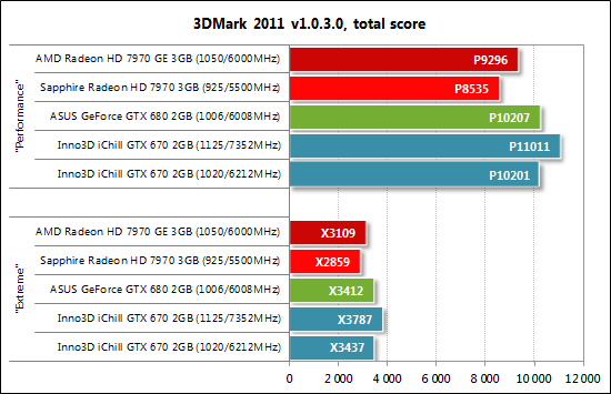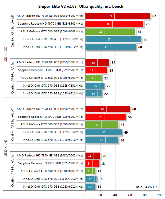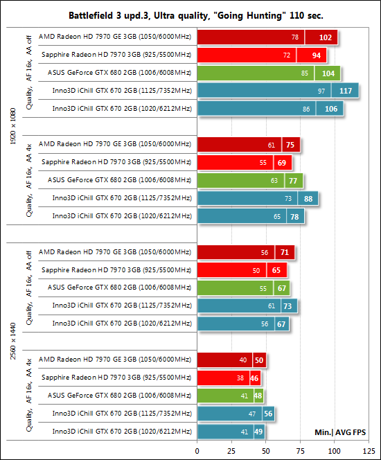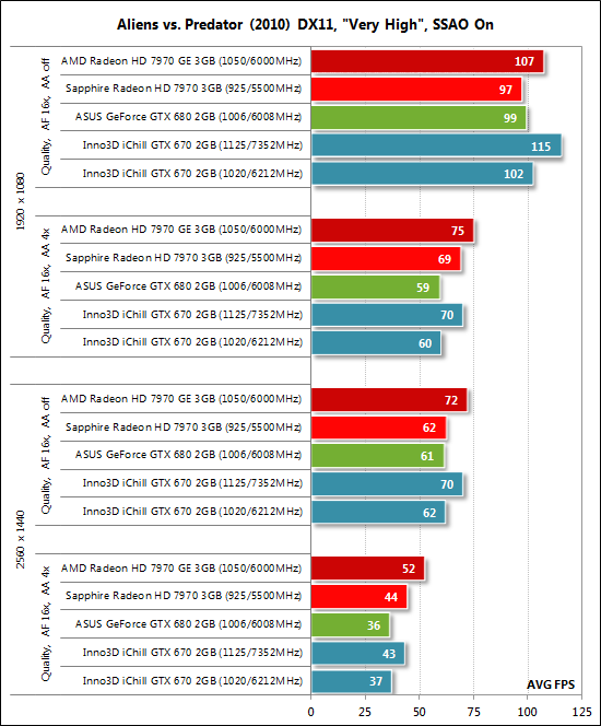 Если в играх реализована возможность фиксации минимального числа кадров в секунду, то оно также отражалось на диаграммах. Каждый тест проводился дважды, за окончательный результат принималось лучшее из двух полученных значений, но только в случае, если разница между ними не превышала 1%. Если отклонения прогонов тестов превышали 1%, то тестирование повторялось ещё как минимум один раз, чтобы получить достоверный результат. Результаты тестов производительности и их анализ Так как стоимость рассматриваемой сегодня видеокарты Inno3D iChill GeForce GTX 670 HerculeZ 3000 составляет 449 долларов США, то мы сравнили её по производительности с видеокартами AMD Radeon HD 7970 и HD 7970 GHz Edition, а также с GeForce GTX 680 в исполнении ASUS. Все три названные видеокарты были протестированы на номинальных для эталонных видеокарт частотах, ну а продукт Inno3D, формально стоящий на ступеньку ниже названных карт, попробует достичь их производительности при разгоне. В некоторых тестах, помимо диаграмм, мы будем приводить скриншоты с результатами (слева — на номинальных частотах, справа — на повышенных). Начнём, как обычно, с 3DMark. 3DMark 2011 ![]() Первый сюрприз Inno3D iChill GeForce GTX 670 HerculeZ 3000 преподнесла в 3DMark 2011 — её производительность даже на номинальных частотах оказалась равна производительности GeForce GTX 680. Более того, при разгоне видеокарты Inno3D она становится абсолютным лидером сегодняшнего мини-тестирования. Metro 2033: The Last Refuge Такую же ситуацию мы можем наблюдать и в игре Metro 2033: The Last Refuge: ![]() То есть разогнанной GeForce GTX 670 не составляет никакого труда обойти и GeForce GTX 680, и обе вариации Radeon HD 7970 (в их номинальном режиме работы, разумеется). Aliens vs. Predator (2010) ![]() С успехом выступает Inno3D iChill GeForce GTX 670 HerculeZ 3000 и в игре Aliens vs. Predator (2010) где ей даже удаётся полидировать в наименее ресурсоёмком режиме. В трёх остальных режимах тестирования разогнанная GeForce GTX 670 немного проигрывает только AMD Radeon HD 7970 GHz Edition. Total War: Shogun 2 ![]() Видеокарты на графических процессорах AMD лучше справляются с последней версией игры Total War: Shogun 2, поэтому NVIDIA их здесь не достать. Тем не менее и в этом тесте есть за что похвалить видеокарту Inno3D iChill GeForce GTX 670 HerculeZ 3000, которая на номинальных частотах демонстрирует такую же производительность, как и старшая GeForce GTX 680, а при разгоне легко обходит её. Crysis 2 ![]() Справился продукт Inno3D и с Crysis 2 даже в разрешении 2560х1440 при ультравысоких настройках качества графики, в очередной раз обойдя при этом GeForce GTX 680 на номинальных частотах и лидируя при разгоне. Battlefield 3 Такую же картину, только при более высоком уровне производительности, мы можем наблюдать и в игре Battlefield 3: ![]() Sniper Elite V2 Benchmark А вот в Sniper Elite V2 ситуация складывается несколько иначе: ![]() Как и в Total War: Shogun 2, в этой игре лидерство принадлежит видеокартам на графических процессорах AMD. А две GeForce соперничают друг с другом, и в этой их борьбе победу вновь одерживает Inno3D iChill GeForce GTX 670 HerculeZ 3000, что, впрочем, уже не удивительно. ⇡#ЗаключениеС уверенностью можем сказать, что Inno3D iChill GeForce GTX 670 HerculeZ 3000 2 Гбайт — одна из лучших GeForce GTX 670. Несмотря на тот факт, что данный экземпляр видеокарты не продемонстрировал наивысших частот при разгоне, её оверклокерский потенциал находится на самом высоком уровне (напомним, видеокарта стабильна при 1125/7352 МГц). Тому способствуют качественная печатная плата с усиленной схемой питания и, конечно же, безупречная система охлаждения с очень высоки