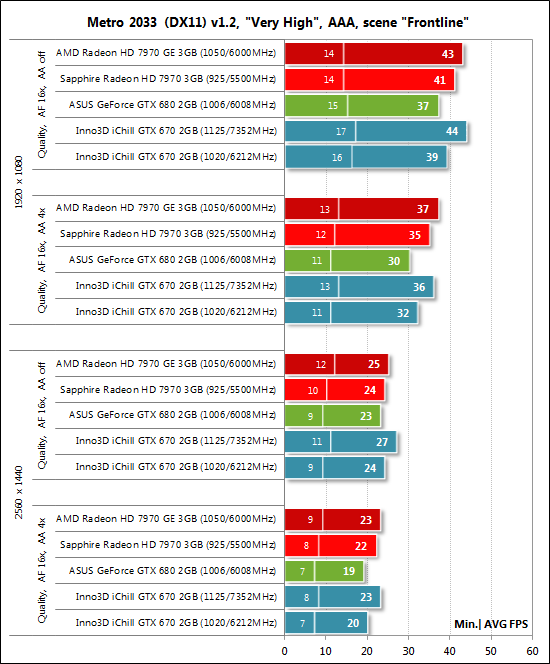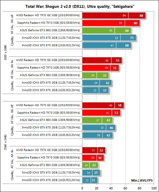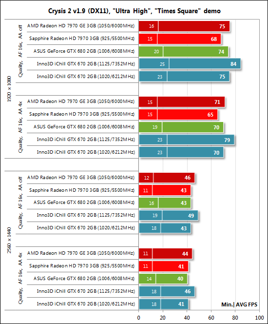 Производительность видеокарт была проверена в двух разрешениях: 1920х1080 и 2560х1440 пикселей. Для тестов были использованы два режима качества графики: Quality + AF16x — качество текстур в драйверах по умолчанию с включением анизотропной фильтрации уровня 16х, и Quality + AF16x + MSAA 4х (8х) с включением анизотропной фильтрации уровня 16х и полноэкранного сглаживания степени 4x или 8x, в случаях когда среднее число кадров в секунду оставалось достаточно высоким для комфортной игры. Включение анизотропной фильтрации и полноэкранного сглаживания выполнялось непосредственно в настройках игр. Если данные настройки в играх отсутствовали, то параметры изменялись в панелях управления драйверов Catalyst и GeForce. Там же была отключена вертикальная синхронизация. Больше никаких изменений в настройки драйверов не вносилось. Так как мы уже неоднократно тестировали ранее GeForce GTX 670, то в сегодняшней статье список тестовых приложений был сокращён до одного полусинтетического пакета и шести наиболее ресурсоёмких игр: