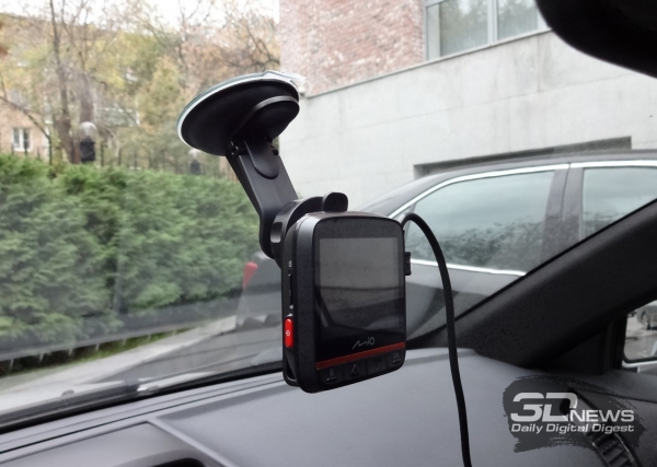 Тем более что угловая вилка miniUSB сориентирована так, что «смотрит» вверх, — соответственно, при традиционном использовании провод сильно изгибается, а разъём получает ненужную механическую нагрузку. По замыслу инженеров Mio, кабель надлежит закрепить в автомобиле, для этого в коробочку кладут шесть держателей на двустороннем скотче. Любой обычный провод USB → Mini USB стандартной длины, подключенный через USB-переходник в прикуриватель, также позволяет заряжать регистратор — на случай, если прокладывать длинный кабель совсем уж не хочется.