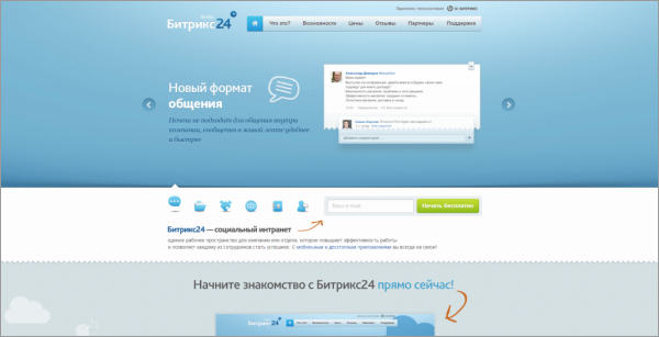 Сервис «Битрикс 24» был выпущен в свет относительно недавно — в апреле 2012 года, но благодаря репутации и усилиям «родительской» компании уже набрал широкую популярность. Построенное на движке «1C-Битрикс: Управление сайтом» облако сейчас входит в число приоритетных направлений деятельности «1С-Битрикс». В основе сервиса лежит концепция социального интранета — информационной среды внутри отдельного предприятия, при этом число сотрудников не имеет значения — их может быть всего пара или несколько сотен. Начать пользоваться сервисом просто: достаточно ввести e-mail администратора и указать домен третьего уровня (по типу mycompany.bitrix24.ru). Потом его можно будет сменить на свой собственный, однако для этого нужно перейти на платный тарифный план.