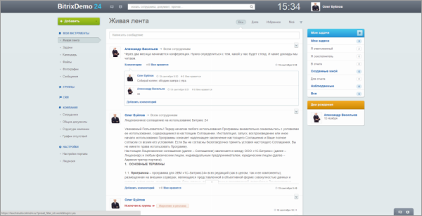 Работа с сервисом похожа на использование социальной сети. Из этого вытекает два последствия: во-первых, освоиться здесь будет легко любому сотруднику, у которого есть аккаунт «Вконтакте» или «Одноклассников», а во-вторых — «Битрикс 24» может стать полезной заменой этим сервисам. Ведь, как известно, офисные работники любят проводить время в соцсетях — так пусть лучше смотрят фото и ставят лайки в пределах корпоративного интранета. Схожесть с соцсетями сервису с первого взгляда придает «живая лента», которую пользователи, войдя под своим аккаунтом, видят на главной странице. Она состоит из последних обновлений сотрудников: кто добавил задачу, загрузил документ, создал рабочий отчет и тому подобного. Также в ленте можно оставлять сообщения, адресованные другим сотрудникам, с прикрепленными к ним файлами, ссылками, изображениями и видеороликами. Таким образом, лента позволяет быть в курсе текущих событий в компании, при этом ее можно фильтровать по авторам, группам, датам и прочим параметрам, чтобы не читать все подряд. А записи в ней можно комментировать и отмечать лайками.