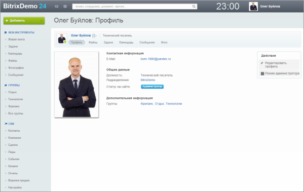 Помимо «живой ленты», сервис предоставляет серьезную функциональность для организации рабочего процесса и коммуникаций между сотрудниками. В левом меню отображается список доступных разделов сервиса: это «Мои инструменты», «Группы», «CRM», «Компания» и «Настройки». Остановимся на них подробнее. «Мои инструменты» — это информация, генерируемая сотрудниками: задачи, события в календаре, загружаемые файлы, фотографии и сообщения в ленте. Все это доступно для просмотра как вам, так и другим пользователям портала — каждый сотрудник имеет персональную страницу, на которой отображаются сведения из профиля и перечисленные разделы.