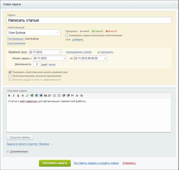 Задачи — важнейшая составляющая планирования. Их можно назначать как себе, так и своим подчиненным, если таковые имеются. Потребуется указать ответственных, выбрать время выполнения, приоритет, можно добавить описание и напоминание, а также подключить наблюдателей и использовать элементы CRM. Если нет времени на заполнение полей, вы можете воспользоваться формой создания быстрой задачи. Кроме того, присутствует возможность сохранить шаблоны повторяющихся задач, чтобы избежать рутины. Что касается просмотра добавленных задач в списке, то здесь можно задействовать фильтр, который одновременно используется как поиск в архиве — ведь завершенные задачи никуда не исчезают. У фильтра довольно много режимов — «Я ответственный», «Я исполнитель» и так далее вплоть до периода, пока задача находилась в работе. И наконец, есть несколько режимов отображения задач: «С подзадачами», «Плоский», «Диаграмма Ганта», «Отчеты». Диаграмма Ганта будет полезной пользователям, искушенным в планировании деятельности, а вот отчеты по работе приходится составлять практически всем, и присутствующий здесь конструктор будет весьма кстати.