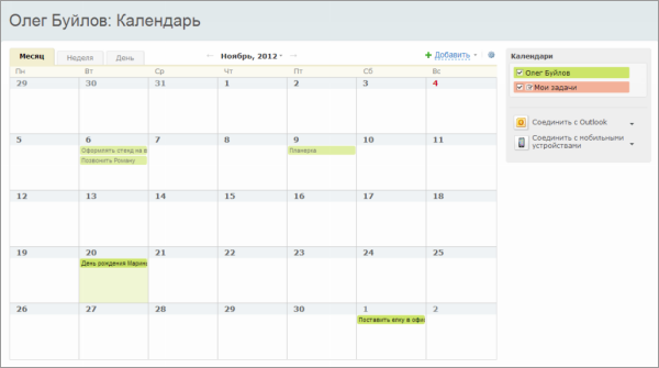 Календарь в «Битрикс 24» имеет три режима отображения — месяц, неделя, день — и показывает как добавленные вами задачи, имеющие привязку ко времени, так и отдельно созданные события. Их можно добавлять с помощью планировщика или самостоятельно, они включают в себя описание, приглашенных участников и другие настройки. Важно упомянуть, что вы можете подключать и отключать события из активных календарей: по умолчанию это личный календарь и ваши задачи, но можно создавать новые или добавлять календари других пользователей, а также внешние календари в формате CalDav (его использует Google Calendar) и MS Outlook.
