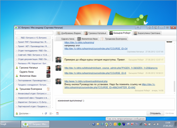 Помимо всего перечисленного, сервис служит для контроля за рабочим временем сотрудников. Придя в офис, пользователь должен произвести на часах запуск рабочего дня, в отведенное время поставить учет на паузу, а в конце завершить рабочий день и отправить руководителю отчет, в котором перечислить все сделанное за день. Кроме того, на сайте ведется график отсутствий, где отмечаются все пропуски сотрудников, связанные с теми или иными причинами (отпуск, больничный и так далее). Еще одна фишка сервиса — это встроенный мессенджер. Он позволяет переписываться со всеми сотрудниками компании и вполне заменяет ICQ, тем более что для «Битрикс 24» существует приложение под Windows и Mac, которое позволяет оставаться на связи даже после того, как вы закрыли браузер. Есть приложения и для мобильных устройств: пока готова версия только для iPhone и iPad, но в скором времени выйдет и для Android. Таким образом, руководитель может отправить сообщения своим подчиненным, где бы они ни находились.
