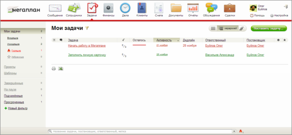 Рассмотрим функциональность модулей, которых в «Мегаплане» присутствует более десятка. Стартовым является раздел «Задачи», с него начинается работа. Задачи могут отображаться списком, иерархией или в виде диаграммы Ганта и имеют множество свойств: название, суть, постановщик, ответственный, дедлайн, степень завершенности. При добавлении задачи также можно указать список дел, прикрепить файлы, добавить теги, назначить повторение, участников (это могут быть соисполнители, аудиторы и заказчик), составить план работ, ввести бонусы или штрафы. Кроме того, есть отдельный тип задач — проекты, где обозначаются менеджер, команда и присутствует точка старта. Задачи можно фильтровать, как письма: «Входящие», «Исходящие», «Горящие», «Завершенные», «На паузе» и так далее. Добавляются и собственные фильтры на основе комбинации различных условий.