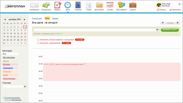 Другой модуль, предназначенный для планирования времени, — это «Дела», куда обычно включаются мелкие текущие события: сходить туда-то, позвонить тому-то и тому подобные. В разделе есть три страницы: список, ежедневник и еженедельник, где вы можете просматривать дела в удобном формате. Понятно, что в календарь попадают только те из них, которые имеют привязку ко времени, а если добавляется «быстрое» дело, оно входит только в чек-лист, которых, кстати, может быть несколько. Добавлять дела можно выделением промежутка времени на календаре или с помощью умной строки ввода. «Мегаплан» понимает русский язык и умеет распознавать фразы вроде «27 декабря в 17:30 самолет» или «сегодня вынести мусор». При редактировании дела можно выбрать его тип: «дело», «звонок», «встреча», «совещание», «праздник», «спорт». Они различаются набором доступных полей: везде есть описание, время, повторения и напоминания, но не везде присутствуют участники и место. Дела в календаре можно разделять по этим категориям и по участникам. Еще одна фишка сервиса — он поддерживает двухстороннюю интеграцию с Google Calendar.