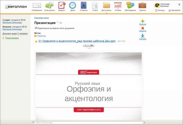 Что касается коммуникаций между сотрудниками, то они осуществляются с использованием модуля «Сообщения», который работает как внутренняя электронная почта компании. У сообщений есть получатели, тема, содержание и вложенные файлы, они делятся на входящие, отправленные и удаленные. Большой оперативности в этом нет, и заменить ICQ, как «Битрикс 24» со своим мессенджером, «Мегаплан» не сможет. Впрочем, сообщения — это не весь арсенал продукта: еще здесь есть раздел «Обсуждения», предназначенный для группового обсуждения новостей, корпоративных вечеринок, планов по работе и тому подобного. Он построен по принципу форума, где есть темы и реплики участников. Обмен файлами между пользователями происходит в модуле «Документы», где можно загружать на сервис тексты, презентации, PDF, таблицы, изображения и все остальное. Перечисленные типы файлов можно просматривать в онлайне, при этом страницы/слайды переворачиваются с помощью стрелок. Редактирование средствами сервиса не осуществляется — для этого нужно скачивать файл на компьютер.