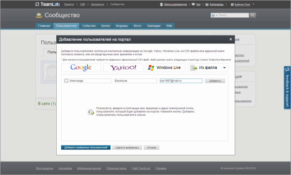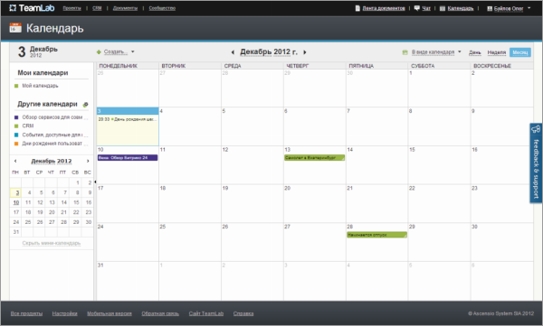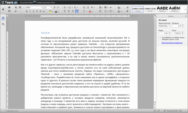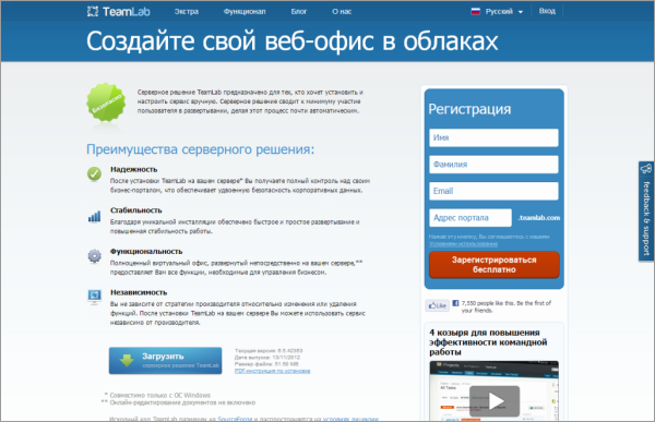 Платформа TeamLab была разработана латвийской компанией Ascensio System SIA в 2009 году, а сегодня доступна уже на восьми языках, включая русский. В отличие от рассмотренных ранее сервисов, TeamLab — это открытое программное обеспечение. Исходный код продукта доступен на SourceForge и распространяется по условиям лицензии GNU GPL v3, хотя туда и не были включены некоторые последние функции. «Облачная» версия TeamLab доступна бесплатно с ограничением в 1 Гбайт дискового пространства, а за $49 в месяц можно пользоваться дополнительными сервисами — 50 Гбайт места и улучшенным загрузчиком файлов.