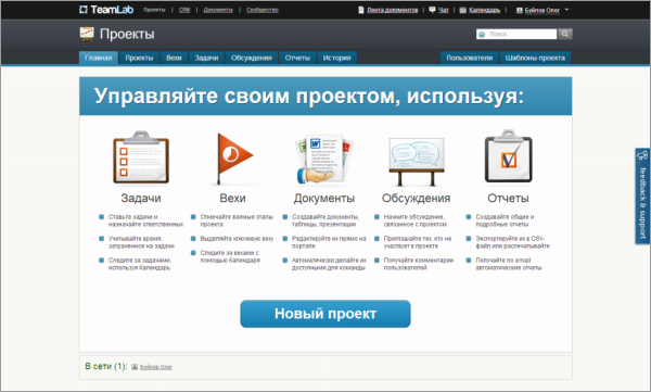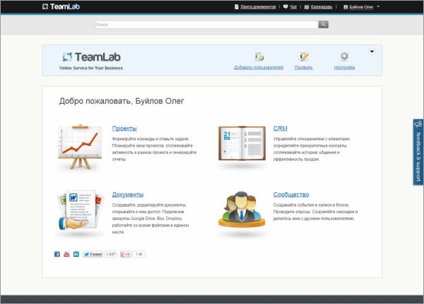 Как и в других сервисах, после регистрации вы можете войти по адресу своего домена вроде mycompany.TeamLab.com, а потом сменить его на свой собственный домен, причем для этого необязательно платить. Первое, что видит пользователь при входе в TeamLab, — окно с иконками разделов сайта: «Проекты», «CRM», «Документы», «Сообщество». Разработчики не стали смешивать все в одном интерфейсе, а отделили одно от другого. В данном случае такое решение оправданно: функциональность каждого из разделов получилась достаточно широкой, и это не пошло в ущерб удобству. В то же время чат, календарь и персональные настройки доступны на верхней панели из любого раздела.