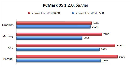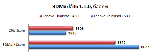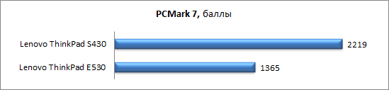 ![]() ⇡# Тестирование: уровень шума и тепловой режимСразу стоит оговориться, что по крайней мере в предоставленном на тестирование образце алгоритм работы активной составляющей охлаждающей системы оставляет желать лучшего. Причём недоработка именно в программной части управления скоростью вращения: при росте температуры вентилятор очень резко, буквально за доли секунды раскручивается до максимума, после чего сразу же начинает плавно сбавлять обороты и за 2–3 секунды достигает необходимой при данной нагрузке скорости вращения. В целом ноутбук довольно тихий, но описанные выше всплески немного мешают комфортной работе. В режиме простоя или невысокой офисной нагрузки уровень шума зачастую не превышает 33,5 дБА, хотя изредка вентилятор ненадолго раскручивается до второй скорости, при которой уровень шума достигает 35,3 дБА. Собственно, на этой отметке он, как правило, держится даже при максимальных нагрузках на процессор и видеоадаптер и крайне редко, неохотно достигает 37,8 дБА. Теоретически вентилятор может быть еще более шумным. Однако достигнуть следующей скорости вращения при температуре окружающей среды 21 градус по Цельсию с использованием нашей стандартной методики не удалось. Для того чтобы заставить систему охлаждения показать максимум, пришлось параллельно запустить Furmark в режиме проверки стабильности и встроенный бенчмарк WinRar. И даже несмотря на то, что ноутбук уже был предварительно разогрет стандартными тестами, перехода на высшую скорость пришлось ждать целых 7 минут. Уровень шума при этом составил 42,2 дБА. Повторимся, при нормальном использовании такое значение практически недостижимо. После часового циклического запуска пакета 3DMark 2006 температура рабочей области в зависимости от точки измерения составила 23–32 градуса Цельсия, а днища — 23–35 градусов. ![]() ⇡# Тестирование: производительностьРезультаты тестирования производительности и времени автономной работы сравним с показателями недавно рассмотренного Lenovo ThinkPad Edge S430, который представляет собой нечто среднее между ультрабуком и классическим ноутбуком. Эта 14-дюймовая модель имеет более тонкий корпус, оснащена «плоским» аккумулятором и вспомогательным SDD объемом 16 Гбайт, однако комплектуется «полноразмерным» процессором и дискретной графикой. Цены S430 и E530 в протестированных конфигурациях сравнимы. ![]()