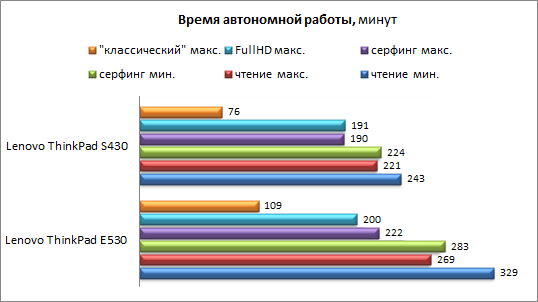 ⇡# Тестирование: время автономной работыВ Lenovo ThinkPad Edge E530 используется наиболее стандартная батарея, построенная на 6 цилиндрических элементах питания. Емкость составляет около 48 Вт*ч — вполне типично для недорогих моделей. ![]() Несмотря на одинаковую емкость аккумуляторов, крупный ThinkPad Edge E530 существенно превзошел своего более компактного родственника по времени автономной работы: в среднем он работает на 30-40 минут дольше. ⇡# ВыводУ Lenovo ThinkPad Edge E530 есть множество достоинств. В первую очередь это спокойный деловой дизайн, невысокая масса и демократичная цена. К ним прилагаются несколько весьма приятных бонусов: два манипулятора, три порта USB версии 3.0 (плюс один порт версии 2.0), высокое качество звука на аналоговом аудиовыходе и вполне приличное время работы от аккумулятора. Но есть и минусы — это недостаточная жёсткость корпуса, прогибающееся основание клавиатуры, невысокое качество дисплея и встроенных динамиков, а также немного странный алгоритм работы активной составляющей охлаждающей системы (впрочем, этот момент могут доработать в финальной прошивке). Данная модель играет в самом конкурентном сегменте рынка: аналоги есть абсолютно у всех ведущих производителей ноутбуков. По большому счету, единственная эксклюзивная особенность ThinkPad Edge — наличие двух манипуляторов. Хорошее подспорье в тендерах, но в борьбе за самостоятельного покупателя это едва ли поможет. Редакция 3DNews благодарит компанию «Графитек» за предоставленный в распоряжение нашей лаборатории измерительный комплекс Spyder4Elite и украинское представительство Lenovo за предоставленный ноутбук Lenovo ThinkPad Edge E530.