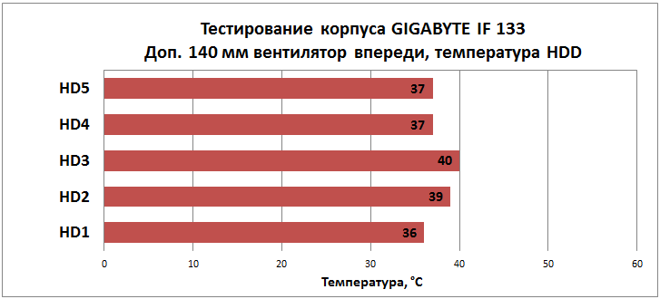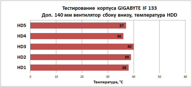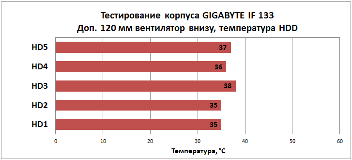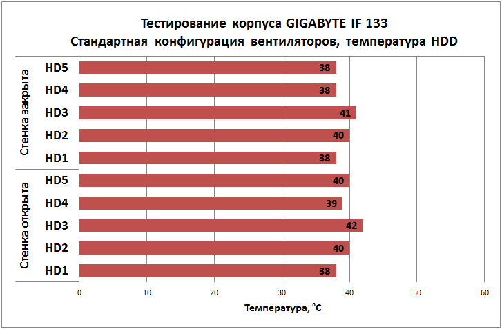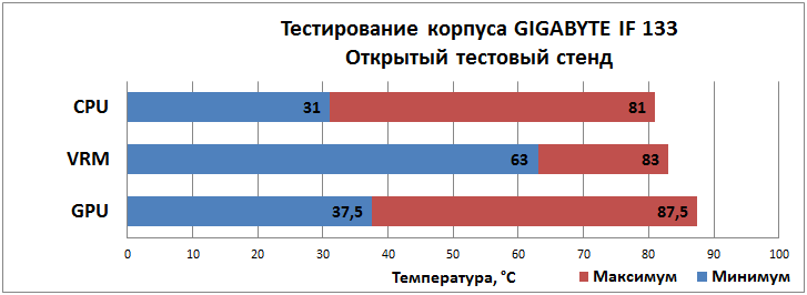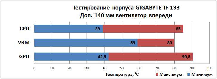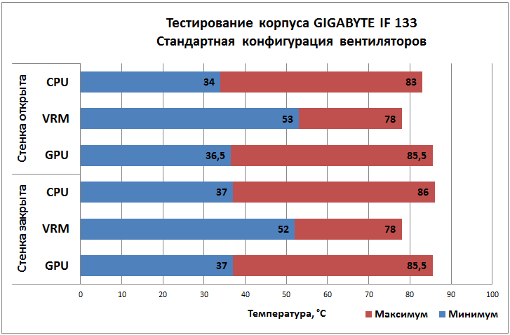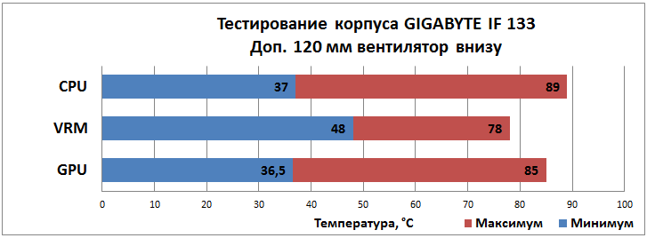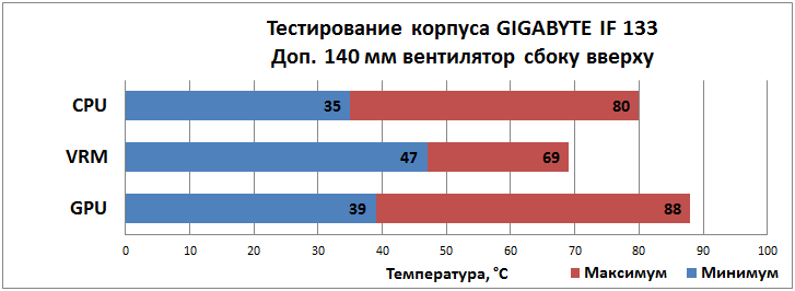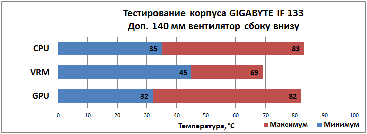 ![]() ![]() Открытый стенд дает нам представление о том, какие температуры будут иметь компоненты, если не мешать естественному отводу тепла. Очевидно, что системе питания процессора и жестким дискам не хватает обдува. ![]() ![]() Стандартная конфигурация вентиляторов здорово снижает температуру жестких дисков. Кроме того, правильно проходящий воздушный поток помогает охлаждать видеокарту. ![]() ![]() Добавление 140-мм вентилятора в отсек пятидюймовых накопителей практически не влияет на температурный режим. Незначительно снизилась температура центрального процессора, но данное размещение все же совершенно неэффективно. Из необычного — выросла температура GPU. ![]() ![]() Перемещение вентилятора на боковую стенку значительно улучшило температуры VRM и ЦП. Самое выгодное размещение дополнительного вентилятора ![]() ![]() Нижняя позиция доступна с некоторым трудом (из-за ширины блока питания стенка с вентилятором закрывается с ощутимым усилием), но она является самой эффективной с точки зрения улучшения охлаждения компонентов. Особенно хорошо это видно по температуре Radeon HD 5850. ![]() ![]() Установка низкооборотистого 120-мм вентилятора на дно корпуса рядом с блоком питания практически не повлияла на температуру комплектующих, сказавшись разве что на охлаждении пары нижних жестких дисков. ⇡#ВыводыСамый приятный, с нашей точки зрения, представитель линейки GIGABYTE IF оставил не менее приятные впечатления. Строгий внешний вид, отличная покраска и качественный пластик — корпус выглядит очень презентабельно, дороже той суммы, которую за него просят. Возможность использования внешней системы водяного охлаждения можно расценивать как бонус или как компенсацию за невозможность установить воздушный суперкулер. Здоровье дисковой подсистемы вне опасности: легкий обдув и непосредственный контакт с металлом делают свое дело. Еще одним «за» является удобный доступ к компонентам системы — его ничто не перекрывает и не блокирует. Таким образом, GIGABYTE IF 133 рекомендуется тем, кто не готов тратить на корпус более полутора-двух тысяч рублей, но в то же время не собирается мириться со слишком простым или, наоборот, чересчур вычурным дизайном аналогичных по цене моделей-конкурентов. Достоинства: