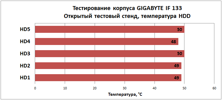 Мониторинг температур был целиком возложен на SpeedFan 4.47. Процессам HD speed был выставлен высокий приоритет. Отдельное ядро для Furmark не выделялось, так как энергопотребление системы в этом случае падало с 440 до 420 ватт. Системный SSD в бенчмаркинге и учете температур участия не принимал. Частота процессора была повышена до 4 ГГц (160x25) при напряжении 1,25 В. В связи с активацией режима, использующего все логические ядра ЦП, скорость вращения крыльчатки процессорного кулера была установлена на максимум (~2400 об/мин, 100%, PWM). Результатом, отображенным на графиках, является либо максимальная температура одного из ядер (для CPU), либо температура, при достижении которой показания не изменялись (GPU и HDD). Температуры жестких дисков вынесены на отдельные графики. Порядок дисков по вертикали совпадает с реальным положением в корпусе, соответственно можно сделать вывод об эффективности охлаждения конкретного диска в конкретном месте. На этих графиках указана только максимальная температура, так как в перерывах между тестами работа HD Speed не приостанавливалась. Температуры простоя и нагрузки обозначены как максимум и минимум. Каждый тест включал в себя 30 минут непрерывного нагрева и не менее 10 минут на остывание компонентов. Минимальное значение температур не следует расценивать как абсолютно точное. Например, система питания процессора (обозначена как VRM), без дополнительного обдува очень медленно меняет свою температуру. Для процессора бралась температура самого горячего из ядер, что также дает разброс в несколько градусов. Radeon HD 5850 нагревался при помощи FurMark 1.10.3 с активированной опцией Burn-in. Обороты его системы охлаждения были зафиксированы на 35% от максимума (~1900 об/мин). Расположение дисков в случае открытого тестового стенда Во время проведения испытаний температура в помещении составляла 26 градусов по Цельсию, мультиметр Victor 86D был переведен в режим отображения относительных показаний, что можно увидеть на приведенной фотографии (значение +2,2 °C было получено для наглядности и не имеет отношения к тесту). При исследовании собранной системы измерительный прибор находился на одном уровне с корпусом, в 10 см от его передней панели. Ввиду того, что расхождение температур на момент начала теста и его окончания едва превысило один градус, им было решено пренебречь. Программы для разогрева и мониторинга На представленном выше скриншоте показано, каким образом создавалась нагрузка на исследуемую систему. Так как в корпусе отсутствует реобас, скорости вращения вентиляторов при тестировании оставались неизменными. Испытания проводились в следующих конфигурациях: