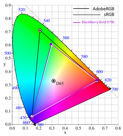 ⇡#ДисплейЭкраны у смартфонов линейки BlackBerry Bold миниатюрные, такие мало где встретишь. По-другому никак — если увеличить дисплей, на маленьком корпусе не хватит места для кнопочной клавиатуры. Важное отличие экрана Bold 9790 — наличие сенсорного слоя. Благодаря этому телефоном можно управлять привычным в 2013 году способом — с помощью пальца. Раньше BlackBerry такое делала только в смартфоне-слайдере Torch 9800: у него физическая клавиатура скрывается под экраном. Это нововведение не слишком полезное по двум причинам: во-первых, оптический трекпад во всех устройствах компании реализован очень хорошо, чтобы привыкнуть к нему, достаточно пары дней общения с гаджетом, во-вторых, из-за маленького экрана попасть пальцем по ссылке в браузере — занятие непростое. Рассчитывать на постоянный zoom in/out двумя пальцами тоже не приходится — перед нами не какой-нибудь «Андроид». Впрочем, в большинстве случаев экран верно реагирует на прикосновения, если объект «тапа» занимает хоть сколько-то значительную площадь дисплея. ![]() Цветовой охват дисплея смартфона BlackBerry Bold 9790 (фиолетовый треугольник) в сравнении с цветовой палитрой sRGB (белый треугольник) и Adobe RGB (черный треугольник) Казалось бы, разрешение у дисплея небольшое — 480x360 точек. Однако совсем маленькая диагональ — 2,45 дюйма — с таким разрешением выдает отличную плотность пикселей PPI: почти 245 точек на дюйм. Это не так уж далеко от пресловутой «ретины». Текст на экране выглядит превосходно: подписи иконок не смазываются, а отдельные пиксели практически незаметны. Дисплей располагает отличным запасом яркости: светимость белого поля достигает 423 кд/м2. Благодаря этому смартфоном можно пользоваться на улице при ярком солнце — в такой ситуации придется кстати и антибликовая прослойка. Черный, правда, тоже задирается до 0,8 кд/м2, но это терпимо. Результирующая контрастность устанавливается на уровне 525:1, что в купе с практически полным охватом палитры sRGB позволяет фотографиям на экране Bold 9790 выглядеть яркими, насыщенными, сочными и при этом вполне реалистичными. Правда, цветовая температура несколько превышает норму, но опять же не критично. ⇡#СвязьНесложно догадаться, на что делают ставку сотрудники BlackBerry в своих смартфонах, — на передачу информации между людьми любым способом: с помощью голосовых звонков, SMS или посредством электронной почты. При этом весь свой потенциал «ежевичные» гаджеты могут раскрыть только с подключенной услугой BlackBerry Internet Service (BIS), предоставляющей безлимитный доступ в Интернет через фирменную точку доступа blackberry.net. Стоимость услуги у операторов «большой тройки» составляет от 350 до 400 рублей в месяц. Доступ в Интернет через стандартную APN одного из операторов работал буквально через раз: только что соединение было — и вот браузер уже предлагает открыть кешированную версию страницы. Отметим, что ни магазин приложений BlackBerry World, ни фирменное приложение обмена мгновенными сообщениями BlackBerry Messenger, ни даже push-почта через стандартную точку доступа оператора работать не захотели. Получается, смартфоны компании без подключенной услуги BIS теряют половину своей функциональности, и это касается абсолютно каждого устройства, в том числе и Bold 9790. Аппаратная клавиатура Blackberry Bold 9790 Работать с push-электронной почтой на смартфоне одно удовольствие: письма приходят во мгновение ока, приложения 