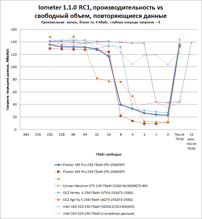Чтобы проверить, насколько падает скорость записи на SSD по мере заполнения, мы поэтапно забиваем его случайными данными на блочном уровне и проводим с помощью Iometer тесты произвольной записи блоков по 4 Кбайт с глубиной очереди запросов 4. Затем на диск посылается команда TRIM (при помощи утилиты Diskpart создается и форматируется раздел на весь объем диска) и еще раз измеряется скорость записи.