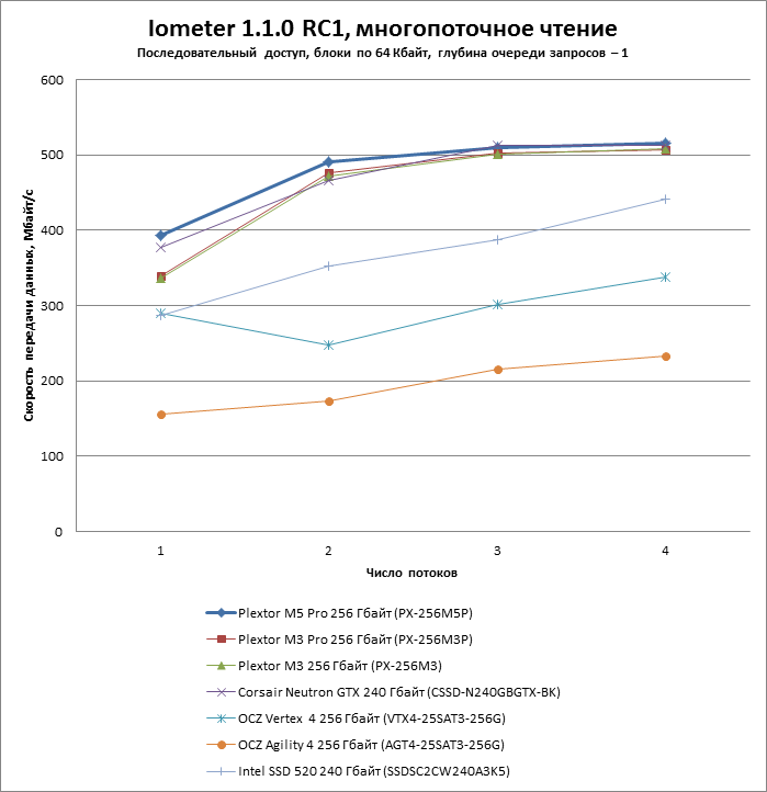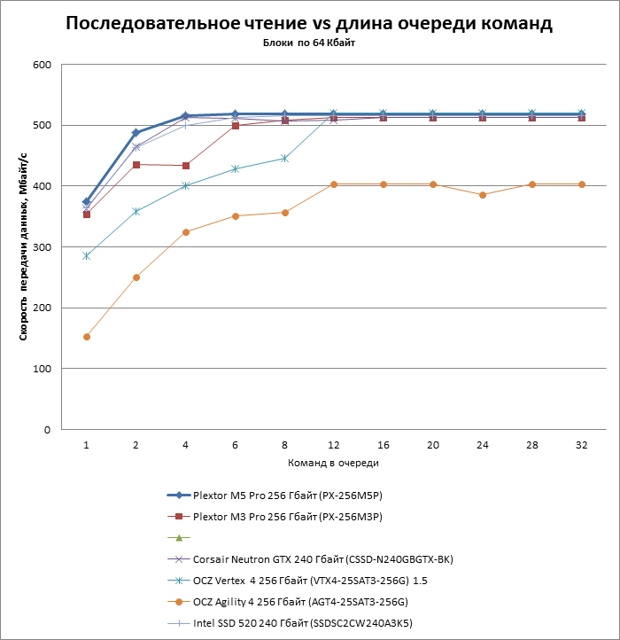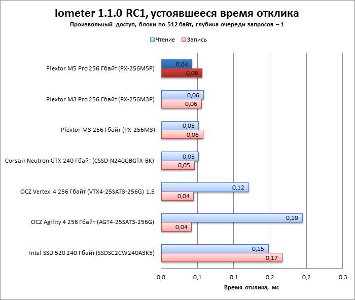 Несмотря на переход от памяти Toggle-Mode DDR 1.X к Toggle-Mode DDR 2.0 и внедрение нового контроллера Marvell 88SS9187, Plextor M5 Pro на практике оказался лишь немногим быстрее, чем Plextor M3 Pro. Есть улучшения в скорости последовательного чтения и записи, но ожидаемого скачка количества операций в секунду при нагрузке, характерной для десктопного компьютера, мы не зарегистрировали. Наверняка у M5 Pro есть существенное преимущество перед M3 Pro в модификации 512 Гбайт, коль скоро заявленная разница между ними настолько велика.