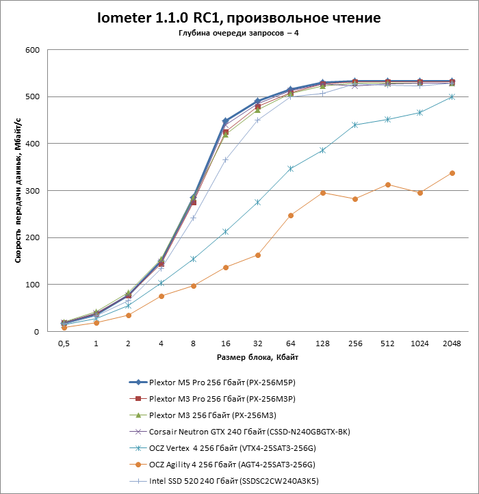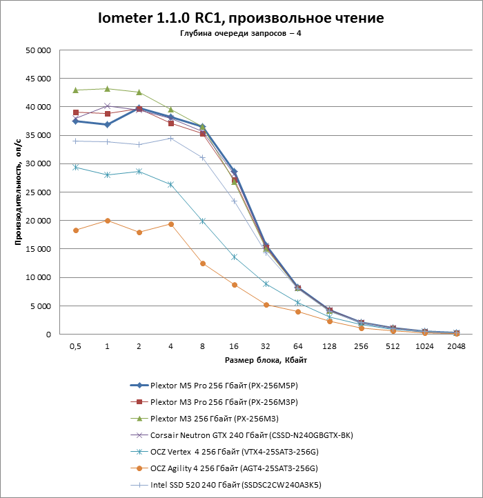 | Макс. скорость произвольного чтения (блоки по 4 Кбайт), оп./с | 92 000 | 100 000 | 100 000 |
