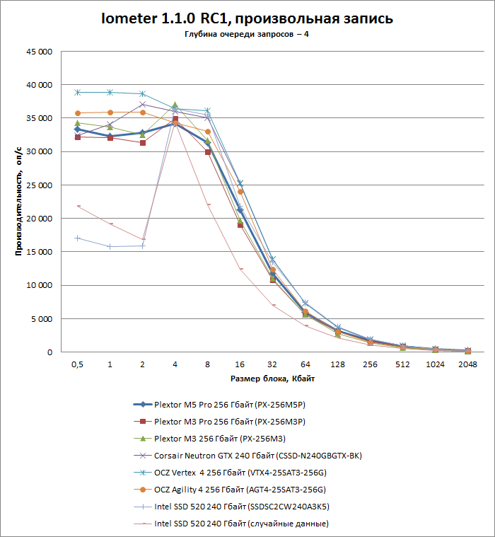 | Макс. скорость произвольной записи (блоки по 4 Кбайт), оп./с | 82 000 | 86 000 | 88 000 |