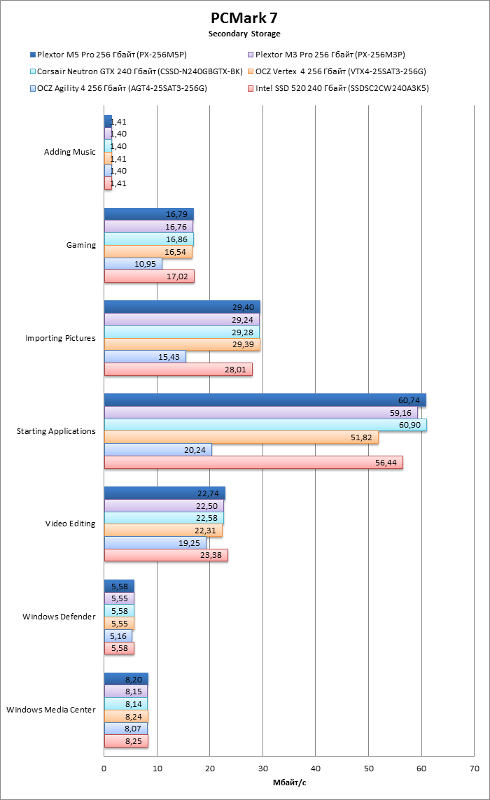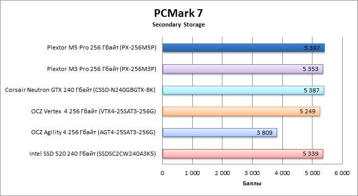 Синтетический тест, эмулирующий нагрузку реальных приложений и различные паттерны использования ресурсов ПК. Бенчмарк установлен на основном накопителе стенда. На тестируемом накопителе создается единственный раздел в файловой системе NTFS на весь доступный объем, и в PCMark 7 проводится тест Secondary Storage. В качестве результатов теста учитывается как итоговый балл, так и скорость выполнения отдельных субтестов.