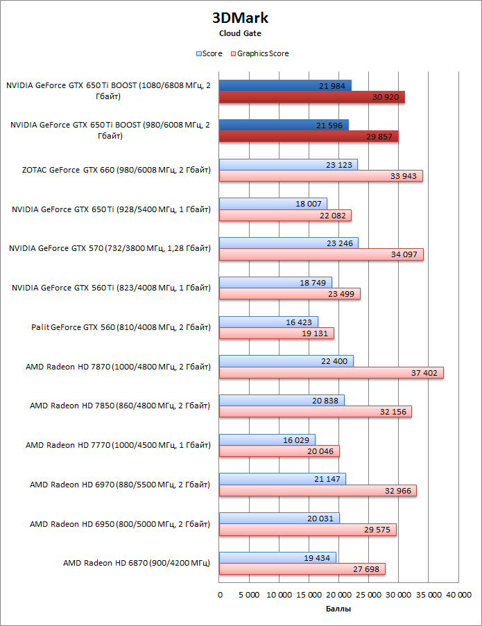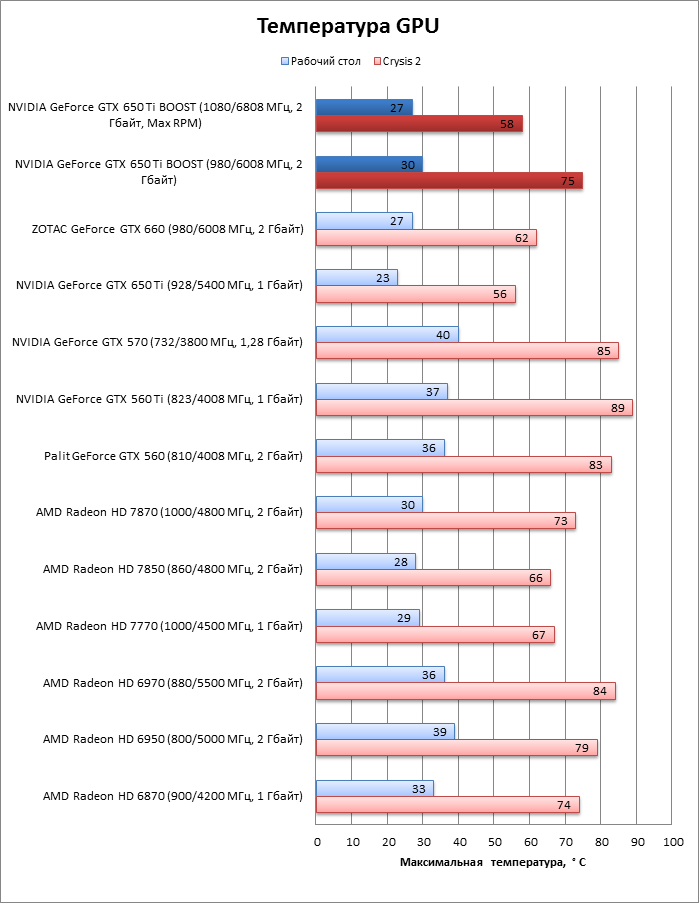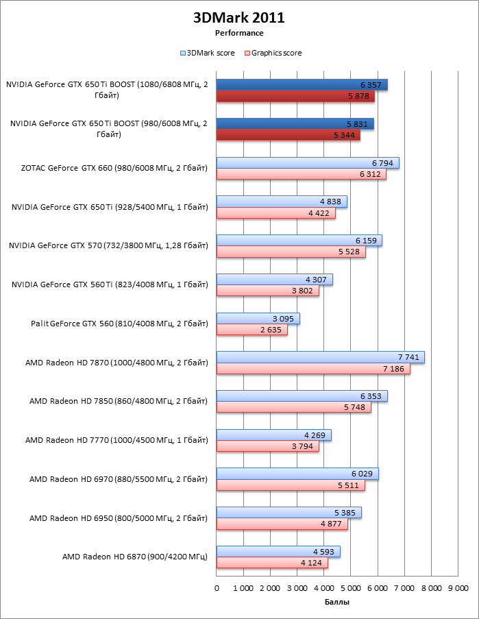 Эмпирически измеренное энергопотребление GTX 650 Ti BOOST нисколько не отличается от такового у GTX 660. Разгон не оказывает на этот показатель большого влияния. В сравнении с видеокартами AMD новинка расположилась между Radeon HD 7850 и HD 7870, что соответствует соотношению формальных показателей TDP этих адаптеров. И поскольку в кои-то веки видеокарта семейства Kepler не имеет большого преимущества по энергопотреблению перед ближайшими конкурентами от AMD и даже потребляет больше, чем HD 7850, ей придется отработать каждый дополнительный ватт в бенчмарках. ![]() От системы охлаждения кустарного вида, установленной на референсной карте, мы не ожидали высокой эффективности. И действительно, она не идет ни в какое сравнение с кулером GeForce GTX 660 в исполнении ZOTAC. Благо ни у одной из версий GTX 650 Ti BOOST, представленных партнерами NVIDIA, референсной системы охлаждения не замечено. В качестве достоинства референсного дизайна отметим, что, как и прочие видеокарты семейства Kepler, GTX 650 Ti BOOST работает весьма тихо, и даже на максимальных оборотах турбины шум относительно невелик. ![]() ⇡#Производительность, синтетические тесты3DMark 2011 (DirectX 11)