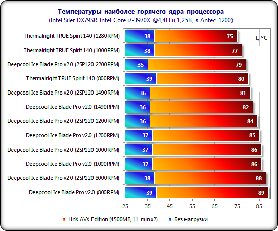 Вот теперь-то мы и можем представить вашему вниманию результаты тестирования эффективности Deepcool Ice Blade Pro v2.0 и его конкурента в таблице и на диаграмме:
