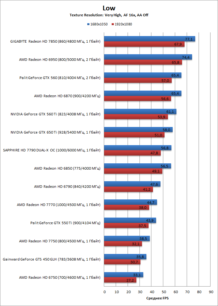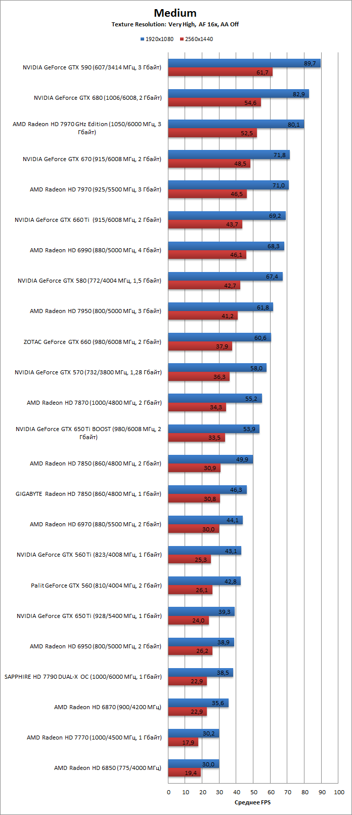В Crysis 3 нет встроенного бенчмарка. Разработчики даже лишили нас возможности записывать и воспроизводить игровые «демки», которая присутствовала в Crysis 2. Поэтому замеры фреймрейта выполнялись с помощью утилиты FRAPS в ходе короткого пробега на первом уровне игры — миссия Post Human. Заметим, что вступительная сцена Crysis 3 обильно нагружена графическими эффектами и сильно бьет по видеокарте. Многие эпизоды игры куда менее требовательны, но есть и такие, где фреймрейт даже ниже в силу либо насыщенной графики, либо недостаточной оптимизации движка. Таким образом, тестовый пробег в Post Human покажет, есть ли у конфигурации запас производительности. Если частота смены кадров падает ниже критической отметки в 30 FPS, это значит, что с тормозами в Crysis 3 вы еще встретитесь неоднократно. Тестирование большинства видеокарт проходило в трех режимах: с предустановками детализации Low, Medium и Very High. Полноэкранное сглаживание во всех режимах было выключено. Не каждая видеокарта или конфигурация SLI/CFX проходила тестирование во всех трех режимах. Для каждого участника представлены результаты в самом ресурсоемком режиме, где он набирает не меньше 30 FPS хотя бы при минимальном из двух разрешений. Если же при максимальном разрешении в том же режиме частота смены кадров опускается ниже 30 FPS, видеокарта дополнительно отправляется на тестирование в более простом режиме. Наконец, те участники, которые опустились ниже 30 FPS при минимальном разрешении и в самом младшем режиме, полностью выбывали из соревнования. В качестве дополнения к основной программе в самом требовательном и бескомпромиссном режиме (детализация Very High плюс MSAA 4x) был протестирован избранный набор самых мощных видеоадаптеров: топовые однопроцессорные видеокарты NVIDIA и AMD, двухпроцессорные флагманы текущего и предшествующего поколений. Со стороны AMD мы также задействовали тандем Radeon HD 7970 GHz Edition в режиме CrossFireX.