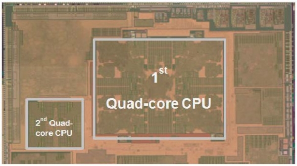 Восемь ядер в Exynos 5 Octa, само собой, далеко не одинаковые. Кое-кто даже ругал Samsung за нарочитое «выпячивание» этой восьмиядерности. То есть ядер действительно восемь, но по сути они представляют собой два разных четырехъядерных процессора на одном кристалле.