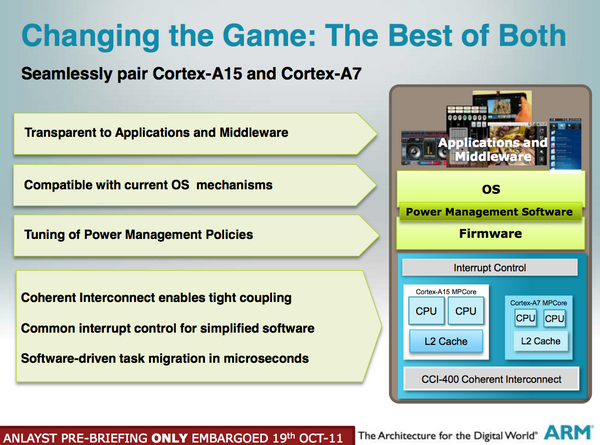 Момент, когда требуется произвести переключение, определяет прошивка от ARM. Переключение между процессорами в теории должно занимать не более 20 микросекунд. Дальше все задачи берут на себя ядра A15, и чем сложнее выполняемое задание — тем больше ядер будет задействовано. В таком режиме чип может потреблять до 6 Вт. Как только система разберется с тяжелой работой, данные вновь будут перенесены в ядра A7, а A15 уснут и перестанут есть электричество в четыре прожорливых горла.
