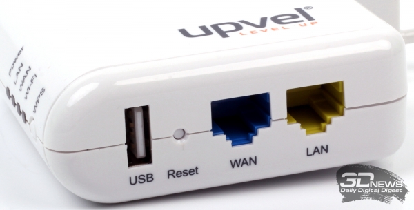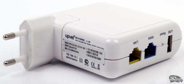 На соседнем торце расположены порты Ethernet на 100 Мбит/с (1 x WAN, 1 x LAN), порт USB 2.0 и кнопка сброса настроек до заводских установок. USB-порт отдаёт стандартные пять вольт и пол-ампера, поэтому он годится для экстренной подзарядки практически любых гаджетов, кроме тех, которые требуют повышенный ток. Любопытно, что через USB-порт можно запитать и само устройство. Встроенный блок питания, согласно спецификациям, потребляет не более 2 Вт и рассчитан на использования в сетях переменного тока с напряжением 100–240 В и частотой 50–60 Гц.