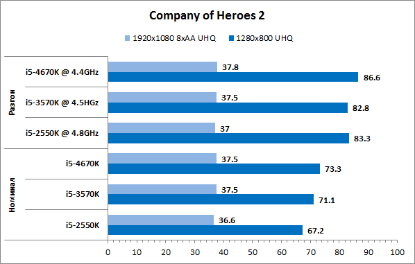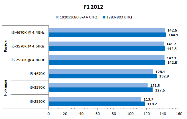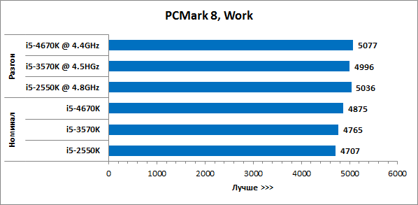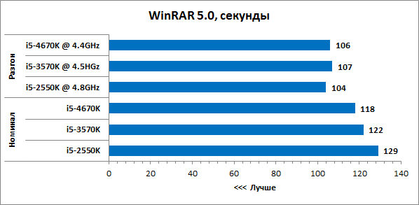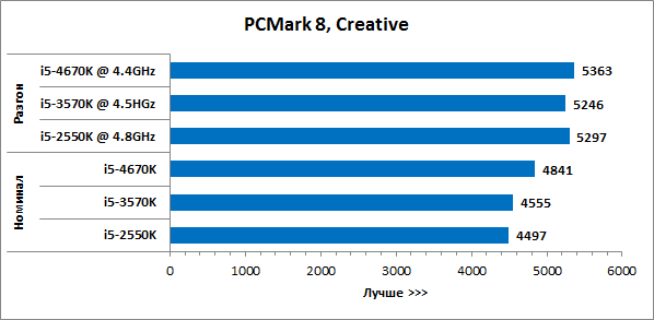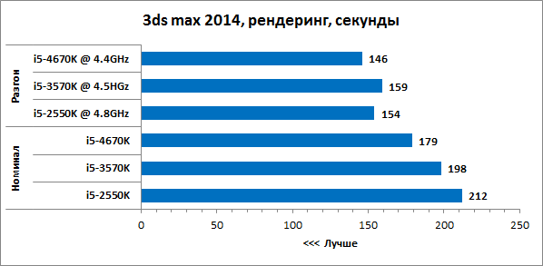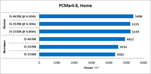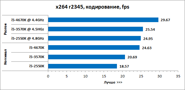 ⇡#Производительность в комплексных тестах![]() ![]() ![]() Мы уже имели возможность оценить преимущество новых интеловских микроархитектур перед старыми и теперь фактически видим ещё одну иллюстрацию произошедшего прогресса, но на этот раз в более реальных условиях. Если закрыть глаза на результаты сценария Work, скорость прохождения которого не так сильно зависит от мощности процессоров в силу его сравнительной простоты, то преимущество нового Core i5-4670K перед Core i5-3570K оценивается в 6-8 процентов. Более старого конкурента, Core i5-2550K, Core i5-4670K опережает увереннее — на 8–13 процентов. Однако в более новых поколениях CPU планомерно уменьшается и тот вклад в производительность, который можно получить за счёт разгона. Если представитель микроархитектуры Sandy Bridge за счёт увеличения тактовой частоты позволял получить 20-процентный прирост быстродействия, то у Ivy Bridge этот прирост уменьшился до 15 процентов. Разгон же новейшего Core i5-4670K выливается лишь в примерно 10-процентное увеличение показателей PCMark 8. В итоге получается, что процессоры разных поколений после небольшого оверклокерского вмешательства в их режимы работы приходят к примерно одинаковому уровню производительности. Разогнанный Haswell опережает разогнанные Ivy Bridge и Sandy Bridge всего лишь на единицы процентов, и убедительным превосходством это называться не может. ⇡#Производительность в приложениях![]() ![]() ![]() ![]() ![]() ![]() ![]() ![]() В зависимости от того, какую нагрузку на процессор создаёт то или иное приложение, соотношение сил на диаграммах может несколько различаться. Однако общая тенденция заключается в том, что максимальный прирост в быстродействии за счёт внедрения новых поколений микроархитектур получается в тех приложениях, которые создают наиболее тяжёлую и многопоточную нагрузку: при шифровании, работе с видеоконтентом высокого разрешения или при финальном рендеринге. В таких случаях превосходство Core i5-4670K над Core i5-2550K в номинальном режиме может превышать 20-процентную величину. И даже доходить до 30 процентов, как в кодере x264, новые версии которого имеют оперативно внедрённую оптимизацию под AVX2- или FMA-инструкции. Бороться с таким перевесом разгоном достаточно тяжело, ведь итоговая частота Core i5-2550K превышает максимально достигнутую нами частоту Core i5-4670K всего лишь на 9 процентов. Поэтому во многих ресурсоёмких приложениях разогнанный до 4,4 ГГц Haswell работает заметно быстрее, нежели Sandy Bridge на частоте 4,8 ГГц. Однако существуют и обратные примеры. Например, в Photoshop и WinRAR разогнанный Core i5-2550K демонстрирует наивысшие результаты, обгоняя не только Core i5-4670K, но и Core i5-3570K. И кстати, обратите внимание, Core i5 с дизайном Ivy Bridge с точки зрения разгона оказывается совершенно бестолковым вариантом. Вне зависимости от того, какая нагрузка ложится на систему, он проигрывает либо своему последователю, либо предшественнику. Но это заключение не распространяется на тот случай, когда процессоры работают в номинальном режиме. Без разгона Core i5-3570K превосходит Core i5-2550K в среднем на 7 процентов, но отстаёт от Core i5-4670K примерно на 10 процентов. То есть, как ему и положено, предлагает промежуточный уровень производительности между Core i5, основанными на микроархитектурах Sandy Bridge и Haswell. ⇡#Производительность в играхТестирование в играх предваряют результаты синтетического бенчмарка 3DMark, который выдаёт некую усреднённую м