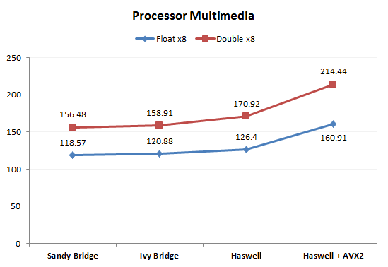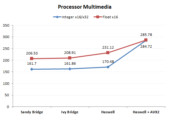 Обычный арифметический тест выявляет, что в Haswell произошёл заметный рост производительности целочисленных операций. Увеличение скорости, очевидно, связано с появлением в этой микроархитектуре порта, специально отведённого под дополнительное целочисленное арифметико-логическое устройство. Что же касается скорости стандартных операций с плавающей точкой, то она с выходом новых поколений процессоров не меняется. Это и понятно, ведь ставка нынче делается на внедрение в обиход новых наборов инструкций с более высокой разрядностью. ![]() ![]() При оценке мультимедийной производительности на первое место выходит скорость выполнения векторных инструкций. Поэтому здесь преимущество Haswell проявляется особенно сильно при использовании набора AVX2. Если же новые инструкции из рассмотрения исключить, то мы увидим лишь 7-процентное увеличение быстродействия по сравнению с Ivy Bridge. Который, в свою очередь, быстрее Sandy Bridge лишь на 1–2 процента. ![]() Похожим образом дело обстоит и со скоростью работы криптографических алгоритмов. Ввод в строй новых поколений микроархитектур поднимает производительность лишь на единицы процентов. Весомый прирост скорости можно получить только в том случае, если использовать Haswell и его новые команды. Однако не следует обольщаться: извлечение преимущества из AVX2 в реальной жизни требует переписывания программного кода, а это, как известно, — процесс далеко не быстрый. Не слишком оптимистично выглядит и то, что произошло с латентностью кеш-памяти.