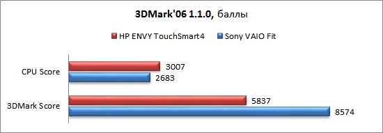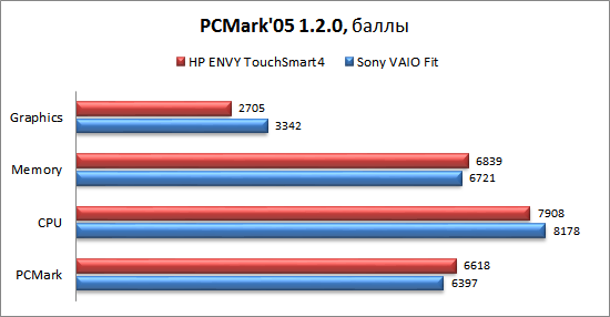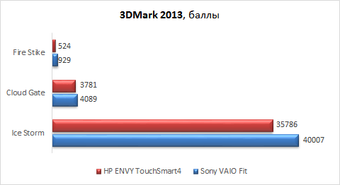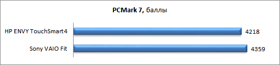 ⇡#ПроизводительностьВ качестве оппонента был взят ультрабук HP ENVY TouchSmart 4, оборудованный процессором Intel Core i5-3317U с интегрированной графикой Intel HD 4000, жёстким диском и кеширующим SSD-накопителем ёмкостью 32 Гбайт. Напомним, что наш главный подопытный, Sony VAIO Fit, оборудован процессором Intel Core i5-3337U с интегрированным видеоядром, а также дискретным видеоадаптером NVIDIA GeForce GT 735M. Дисковая подсистема Sony VAIO Fit основана на гибридном жёстком диске со встроенным SSD-кешем на 8 Гбайт. К сожалению, HP Envy TouchSmart 4 во время тестирования не смог корректно завершить работу в бенчмарке PCMark Vantage, поэтому в таблице ниже приведены результаты только для VAIO Fit. ![]()