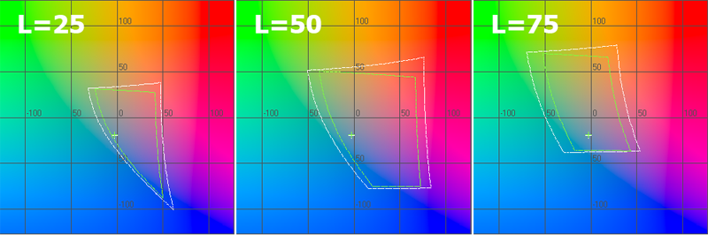 ⇡#ДисплейНоутбук оборудован ЖК-матрицей Chimei Innolux с разрешением 1920х1080 точек и сенсорным слоем, поддерживающим несколько одновременных прикосновений. Немного смущает тип матрицы — TN. Удивительно, но факт: в достаточно дорогом ноутбуке снова используется дешевый дисплей. Как тут не вспомнить Sony T13 с сенсорным экраном, который побывал в нашей тестовой лаборатории этой зимой? Углы обзора у дисплея VAIO Fit, неплохие, поэтому постоянно подстраивать угол наклона не приходится, но всё же они существенно меньше, чем у IPS-панелей. Максимальная яркость не впечатляющая: 278,4 кд/м2. При этом светимость чёрного поля весьма высока — 3,45 кд/м2, так что статическая контрастность выходит крайне скромной — 81:1. Измерения равномерности подсветки проводились после калибровки дисплея для двух уровней яркости — максимальной и половинной (100% и 50%). Равномерность подсветки. Яркость подсветки 100% и 50% Цветовой охват, на первый взгляд, невелик — 75% от sRGB либо 55% от Adobe RGB. Однако стоит отметить, что и многие IPS-панели обладают аналогичным охватом. Для TN-матрицы мобильного ПК — полученный результат можно считать нормальным, хотя мы встречали дисплеи этого типа и более высокого качества. ![]() График цветового охвата в системе Lab для L=25, L=50 и L=75 На иллюстрациях, приведённых ниже, отображены гамма-кривые (чёрные графики), полученные до и после калибровки дисплея, целевая гамма 2,2 (светло-синий график) и коррекция для каждого цвета (красный, синий, зелёный).