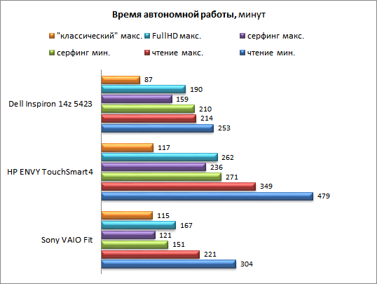 Если судить по результатам тестов, можно сказать, что скорость работы дисковых подсистем обоих ноутбуков практически одинакова. Разве что гибридная система HP Envy TouchSmart 4 оказалась чуть быстрее в единственном тесте — если, конечно, верить PCMark 7. Что же касается графики, то здесь несложно догадаться, кто окажется победителем. Это Sony VAIO Fit — интегрированному в процессор графическому ядру тягаться с отдельным видеоадаптером бесполезно. ⇡#Источник питания и автономная работаВ ноутбуке используется литий-ионный аккумулятор ёмкостью 44 Вт*ч, что маловато для устройства такого размера. Для сравнения мы взяли 14-дюймовый ультрабук Dell Inspiron 14z (Inspiron 5423), который, как и герой нашего материала, оборудован DVD-приводом. Также в этом тесте участвовал HP ENVY TouchSmart 4. Ёмкость аккумулятора первого оппонента составляет 42 Вт*ч, второго — 53 Вт*ч. ![]() Сводная диаграмма длительности автономной работы ⇡#ЗаключениеSony VAIO Fit получился настоящим клубком противоречий. Ноутбук с сенсорным экраном, конечно, уже не такая невидаль, как год назад. В будущем такой тип устройств, станет скорее правилом, чем исключением. А вот лэптопы с DVD-приводом и дальше будут большой редкостью. Целесообразность использования DVD в эпоху повсеместного скоростного Интернета, а также ёмких и дешёвых флешек остаётся под большим вопросом. Дальше — больше. Корпус у ноутбука красив, да и претензий к качеству сборки нет. А вот размещение коммуникационных разъёмов — не очень удачное. Кроме того, устройство получилось излишне марким. Раскладка клавиатуры весьма удобна, да и подсветка клавиш не забыта. Однако основание клавиатуры «гуляет», будто резиновое, а момент срабатывания клавиш совершенно не чувствуется. Про дисплей тоже нельзя сказать много хорошего — обычная TN-матрица, которая, правда, немного отличается от своих аналогов чуть лучшими углами обзора и равномерностью цветопередачи. Цену VAIO Fit также сложно отнести к его сильным сторонам. На момент написания этой статьи за рассмотренную нами конфигурацию просили около 48 тысяч рублей. Для ультрабука такую цену еще можно посчитать приемлемой. Но для обычного лэптопа с TN-матрицей, далеко не самым мощным процессором, средненьким графическим адаптером и без полноценного SSD цена кажется изрядно завышенной — раза так в полтора-два. Благодарим украинское представительство Sony за предоставленное для тестирования оборудование. А также компанию «Графитек» за предоставленный комплект колориметров Spyder4Elite.