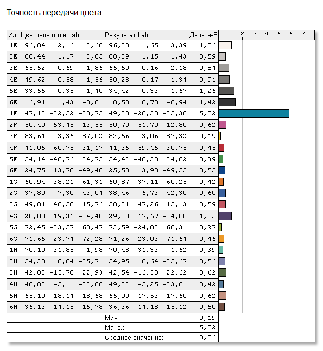 Лучше всех в категории точности отображения отдельных оттенков выступил режим «Выкл.». Его среднее отклонение ΔE составило 2,33, что является хорошим результатом. Далее следуют сразу два пресета: «Управление» и «Экономичный». Их показатели очень близки — 3,82 и 3,85 соответственно. Стоит отметить, что это удовлетворительный результат. Вслед за ними расположились предустановки «Фото», «Игры» и «Кино». Их показатели точности отображения отдельных цветовых оттенков составили 4,85, 5,24 и 5,49. Это по-прежнему удовлетворительные результаты.