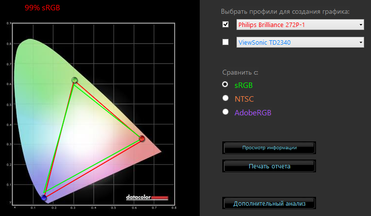Анализ результатов измерений цветовых охватов всех режимов выявил практически полную идентичность различных множеств оттенков. Пять из шести пресетов продемонстрировали результат на уровне 99% от цветового пространства sRGB и 76% от AdobeRGB. Это великолепные показатели, не часто встречающиеся даже у профессиональных моделей. Совсем немного от группы лидеров отстала предустановка «Фото». Ее цветовой охват составляет 98% от цветового пространства sRGB и 76% от AdobeRGB, что также является превосходным показателем. Кстати, характер всех графиков весьма схож: в синей и зеленой области монитор отображает чуть больше оттенков. Более того, вышеуказанные результаты — это площадь пересечения стандартных цветовых пространств и измеренного треугольника, а на деле количество оттенков может заметно превышать их.