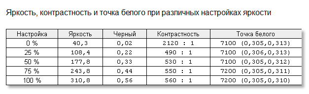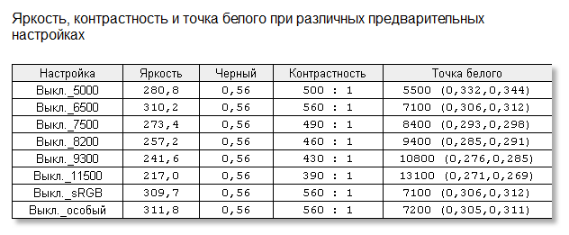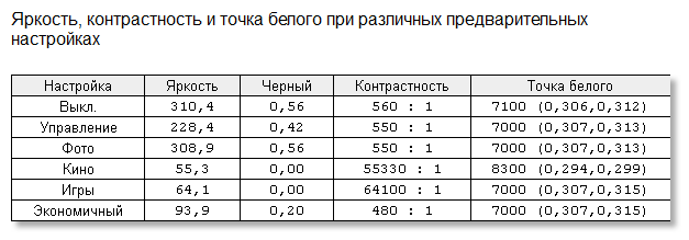 Примечание: внимательный читатель наверняка заметит, что показатели максимальной яркости в процессе различных измерений немного различаются. Разумеется, ничего критичного в этом нет: разброс значений — это естественное явление, поскольку даже если провести два последовательных измерения одного и того же параметра с сохранением всех остальных условий, его значения будут, как правило, немного отличаться друг от друга. Зная это свойство измерительных приборов, испытатели все результаты обычно приводят вместе с погрешностью, однако в нашем случае такой возможности нет: калибратор Spyder4Elite выдает лишь среднее значение. ⇡#Результаты тестированияИтак, монитор оснащен пятью профильными предустановками обработки изображения, которые называются «Управление», «Фото», «Кино», «Игры» и «Экономичный», а также отдельным естественным режимом, когда все настройки полностью отключены (для определенности мы будем называть его пресетом «Выкл.»). Стоит сразу отметить, что в режимах «Игры» и «Кино» невозможно отключить функцию автоматического контраста, поэтому мы не можем ручаться за точность измеренных данных и приведем их лишь в ознакомительных целях. По итогам измерений ширины диапазона яркости наш сегодняшний гость продемонстрировал отличные результаты. Максимальная светимость точки белого составила 310,8 кд/м2. Запас по сравнению с паспортным значением, равным 300 кд/м2, разумеется, небольшой, однако, он все же присутствует. Уровень черного, если не считать практически нулевого значения в самом начале диапазона, изменяется линейно. Поэтому, если отбросить пиковый уровень 2012:1, наибольший результат составил 560:1 при 100% от максимума подсветки. Вполне типичное значение для такого типа матриц. К сожалению, это далеко от паспортного значения 1000:1. ![]() Philips Brilliance 272P — параметры изображения при различных уровнях яркости В результате анализа показателей измерений выяснилось, что лидером к категории измеренной яркости стал пресет «Выкл.» Его результат составил 310,4 кд/м2. Практически вровень с ним идет режим «Фото» со значением яркости 308,9 кд/м2. Далее с большим отставанием от лидеров располагается пресет «Управление» — 228,4 кд/м2. Поскольку мы условились не рассматривать предустановки «Кино» и «Игры» в контексте результатов других режимов, то замыкает нашу сводную таблицу пресет «Экономичный» с показателем яркости, равным 93,9 кд/м2. В принципе, ничего удивительного, ведь основная экономия энергии происходит за счет снижения светимости экрана. В категории измеренной контрастности места распределились похожим образом. На первой позиции вновь расположился режим «Выкл.», чей результат оказался на уровне 560:1. В абсолютной категории это типичное значение для подобных панелей, так что можно назвать такой показатель хорошим результатом. Хотя снова вспоминаются заявленные 1000:1. С небольшим отставанием от лидера следуют предустановки «Управление» и «Фото». Несмотря на то, что демонстрируемые ими значения яркости здорово различаются, соотношения точки белого и черного находятся на одном уровне — 550:1. И замыкает список режим «Экономичный» с показателем контраста, равным 480:1. Этот уровень мы можем назвать лишь удовлетворительным. С цветовой температурой все получилось немного иначе. Пять из шести пресетов продемонстрировали очень близкие результа