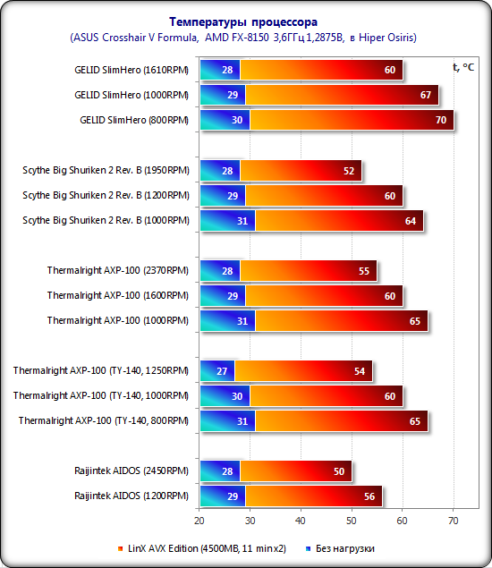 Помимо сравнения HTPC-кулеров друг с другом, мы решили включить в диаграмму результаты тестирования недорогого башенного кулера начального уровня Raijintek AIDOS. Добавим, что регулировка скорости вращения всех вентиляторов систем осуществлялась с помощью нашего контроллера с точностью ±10 об/мин, и перейдём к изучению результатов тестов.