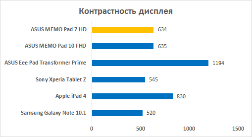 ASUS MEMO Pad HD 7 — стандартный комплект поставки ⇡#ДисплейСемидюймовый экран планшета основан на матрице IPS, благодаря которой у дисплея большие углы обзора. Информация на нём остается читаемой даже при отклонении взгляда от перпендикуляра, характерное падение контрастности совсем незначительное. Разрешение экрана невысокое — 1280x800 точек, результирующая плотность пикселей — 215 единиц на дюйм. Показатель неплохой — шрифты выглядят резко, а кино и фотографии вполне неплохо детализированы. Однако чтобы полностью скрыть зерно, такой плотности недостаточно — отдельные пиксели видны невооруженным взглядом. Впрочем, нельзя сказать, чтобы они совсем уж сильно резали глаз. Планшет быстро и точно распознает нажатия, «понимает» жесты и поддерживает до десяти одновременных касаний. ASUS MEMO Pad HD 7 — результаты теста AnTuTu MultiTouch Test Экран обладает приличным запасом яркости. Максимальная светимость белого поля — 331 кд/м2. Это отчасти компенсирует отсутствие поляризационной прослойки — у пользователей есть шанс рассмотреть происходящее на дисплее под прямыми солнечными лучами, несмотря на то, что он ощутимо бликует и слепнет. Минимальный уровень подсветки белого — 24 кд/м2, — в темноте работать с дисплеем тоже комфортно. ![]() Максимальная светимость черного поля чуть выше, чем хотелось бы, — 0,52 кд/м2 (в данном случае меньше — лучше). Из-за этого при выкрученной на максимум яркости черному чуть не хватает глубины. Впрочем, если вспомнить о цене вопроса, то придется признать: контрастность у дисплея неплохая — 634:1, по результатам наших измерений. ![]() Цветовая температура оттенков серого чуть ниже нормы — она колеблется в диапазоне 5500-5800 К при эталонном значении 6500 К. Это значит, что цвета на экране выглядят самую малость «теплее» должного, однако, чтобы заметить это, нужен тренированный глаз — отклонение не такое уж значительное. ![]() Настроен экран ASUS MEMO Pad HD 7 очень хорошо. Гамма-кривые цветовых компонент и градаций серого практически полностью совпадают с эталонной кривой, допуская лишь минимальные и совершенно незначительные отклонения. Цветопередача у дисплея правильная. Цветовой охват дисплея чуть уже пространства sRGB, правда опять же не критично. В целом дисплей ASUS MEMO Pad HD 7 получился вполне удачным, а уж для бюджетного устройства лучшего и желать не приходится. Электронные документы, веб-странички, кино и фотографии — на экране планшета всё выглядит очень и очень неплохо. ASUS MEMO Pad HD 7 — цветовой охват экрана планшета в сравнении с цветовым пространством sRGB ⇡#ЗвукКак и другие планшеты из линейки MEMO Pad, гаджет оснащён фирменной «аудиотехнологией ASUS SonicMaster, которая сочетает в себе аппаратные и программные компоненты, направленные на повышение качества звука». Внешний динамик устройства имеет приличный запас громкости и вполне неплохую для мобильного устройства детализацию звука. Музыкальные композиции воспроизводятся с нехрипящими басами и аккуратными высокими частотами. ASUS MEMO Pad HD 7 — настройки AudioWizard Программная часть технологии SonicMaster заключается в применении фильтров AudioWizard, подстраивающих уровень звука под воспроизводимый контент. Доступны они как при подключенной гарнитуре, так и при прослушивании аудиодорожек с помощью внешнего динамика. Быстрый доступ к фильтрам AudioWizard осуществляется из меню приложений или из панели уведомлений. ⇡