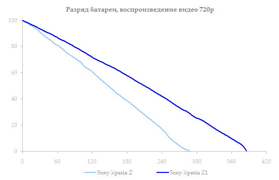 Зато при просмотре фильмов в HD-качестве с максимальной яркостью дисплея — а для современного смартфона это плевая задача, процессор во время воспроизведения может откинуться на спинку кресла — лидер очевиден: Xperia Z1 в таком сценарии живет заметно дольше, чем Xperia Z.