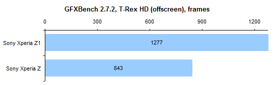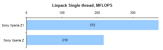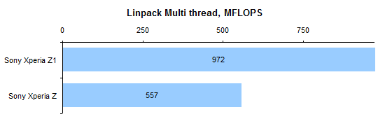 Теперь посмотрим, что на практике получится выжать из имеющегося потенциала производительности. А выжать получается ой-ой-ой сколько: скажем, в Linpack для Android — при всей его кривоватости — Xperia Z1 показывает почти вдвое более высокий уровень производительности.