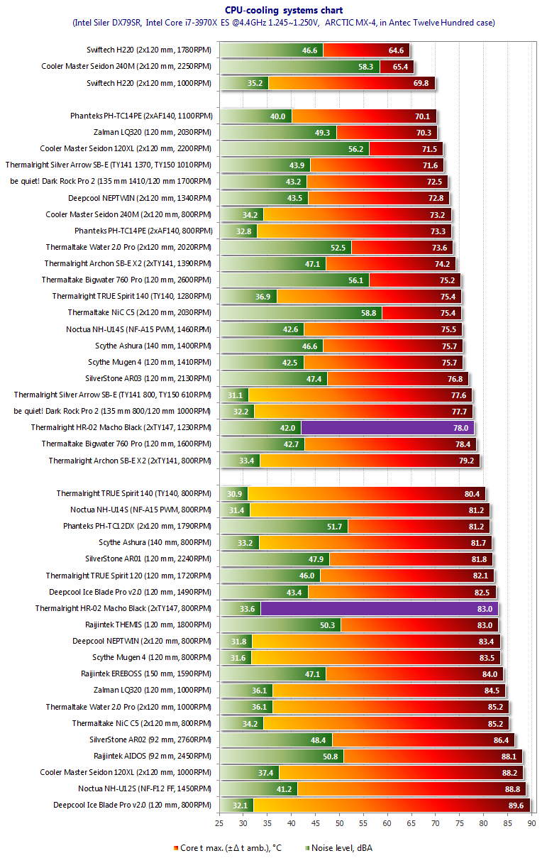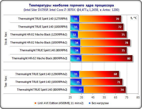 Полный снимок экрана во время проведения одного из циклов тестирования выглядит так: Нагрузка на процессор создавалась двумя последовательными циклами LinX AVX с указанными выше настройками. На стабилизацию температуры процессора между циклами отводилось 8–10 минут. За окончательный результат, который вы увидите на диаграмме, принята максимальная температура самого горячего из шести ядер центрального процессора в пике нагрузки и в режиме простоя. Кроме того, в отдельной таблице будут приведены температуры всех ядер процессора и их усреднённые значения. Комнатная температура контролировалась установленным рядом с системным блоком электронным термометром с точностью измерений 0,1 °C и возможностью почасового мониторинга изменения температуры в помещении за последние 6 часов. Во время данного тестирования температура окружения колебалась в диапазоне 21,3–22,0 °C. Измерение уровня шума систем охлаждения осуществлялось с помощью электронного шумомера CENTER-321 в период от одного до трёх часов ночи в полностью закрытой комнате площадью около 20 м2 со стеклопакетами. Уровень шума измерялся вне корпуса системного блока, когда источником шума в комнате являлся только сам кулер и его вентилятор. Шумомер, зафиксированный на штативе, всегда располагался строго в одной точке на расстоянии ровно 150 мм от статора вентилятора. Системы охлаждения размещались на самом углу стола на пенополиуретановой подложке. Нижняя граница измерений шумомера составляет 29,8 дБА, а субъективно комфортный (просьба не путать с низким!) уровень шума кулеров при измерениях с такого расстояния находится около отметки 36 дБА. Скорость вращения вентиляторов изменялась во всём диапазоне их работы с помощью специального контроллера путём изменения питающего напряжения с шагом 0,5 В. Сравнивать Thermalright HR-02 Macho Black по эффективности и уровню шума мы будем с его собратом и одновременно лидером среднего ценового сегмента — кулером Thermalright TRUE Spirit 140 ($40-45) с одним штатным 140-мм вентилятором и с двумя такими вентиляторами. Добавим, что регулировка скорости вращения всех вентиляторов систем охлаждения осуществлялась с помощью нашего контроллера с точностью ±10 об/мин в диапазоне от 800 об/мин до их максимума с шагом 200 об/мин. ⇡#Результаты тестирования и их анализЭффективность охлаждения Результаты тестирования эффективности систем охлаждения Thermalright представлены в таблице и на диаграмме.  К сожалению, Thermalright HR-02 Macho Black не смог впечатлить нас своей эффективностью. При прямом сравнении с Thermalright TRUE Spirit 140 (в комплектации с одним штатным вентилятором) новинка проигрывает 5 градусов Цельсия при максимальной скорости вентиляторов, 6 градусов Цельсия при 1000 об/мин и вновь 5 градусов Цельсия при 800 об/мин. И это притом, что у Thermalright HR-02 Macho Black на один вентилятор больше. Если же на TRUE Spirit 140 установить дополнительный вентилятор, то проигрыш никелированного Macho увеличивается до 7 градусов Цельсия в каждом из скоростных режимов работы вентиляторов. Увы, но даже в самом тихом режиме, где, казалось бы, разреженный радиатор HR-02 должен превосходить сравнительно плотный радиатор TRUE Spirit 140, разница в эффективности между двумя этими кулерами довольно значительна. Теперь давайте внесём полученные на Thermalright HR-02 Macho Black результаты в сводную таблицу* и на диаграмму, где все протестированные кулеры представ