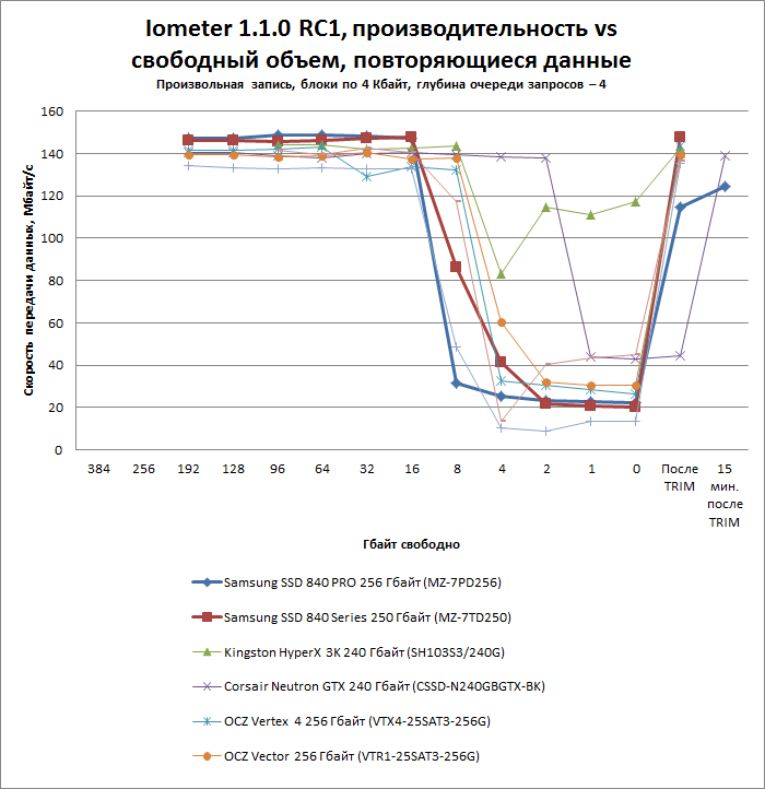 Чтобы проверить, насколько падает скорость записи на SSD по мере заполнения, мы поэтапно забиваем его случайными данными на блочном уровне и проводим с помощью Iometer тесты произвольной записи блоков по 4 Кбайт с глубиной очереди запросов 4. Затем на диск посылается команда TRIM (при помощи утилиты Diskpart создается и форматируется раздел на весь объем диска) и еще раз измеряется скорость записи.