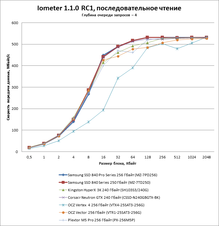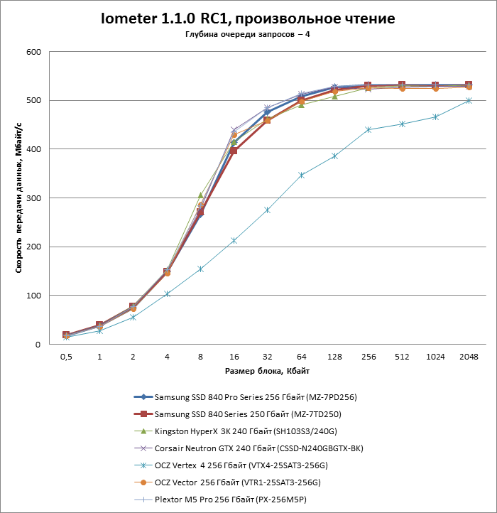 В первом тесте оба наших главных подопытных показали максимальный результат независимо от размера считываемых блоков. Среди других участников тестирования столь безупречный график наблюдается только у Corsair Neutron GTX.