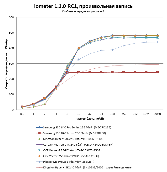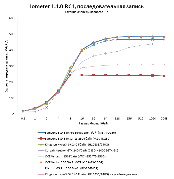 В тестах на последовательную запись начинает сильно отставать накопитель Samsung 840 Series 250 Гбайт (MZ-7TD250) — его скорость перестаёт расти при размере блока более 8 Кбайт — и в результате не превосходит отметки в 250 Мбайт/с, что приличествует скорее SSD с интерфейсом SATA 3 Гбит/с, чем с современным SATA 6 Гбит/с. У Samsung 840 Pro Series дела обстоят намного лучше. Как и в тесте на чтение, его пиковая производительность (которая достигается при размере блока 256 Кбайт) не меньше, чем у плотной группы наиболее успешных конкурентов.